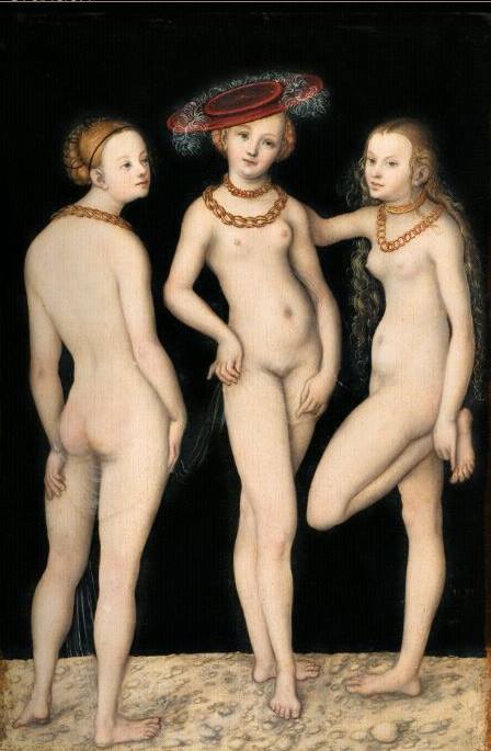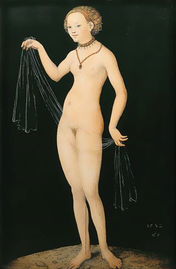 Les propongo en esta entrada una visión sobre el desnudo femenino en Lucas Cranach “El Viejo”. La fecha de realización de estas obras está entre 1530 y 1534, veinte años después de la Venus dormida de Giorgione (1510) e incluso posterior a la de Tiziano, que mostraba en mi post de ayer. Dos mundos diferentes encuadrados ambos en lo que se conoce como Renacimiento. Usualmente se considera que el Renacimiento italiano hace hincapié en la belleza de las formas mientras que el arte flamenco de la época era más realista, se interesaba mucho en la descripción de la personalidad de las figuras y resultaba también más detallista en los ornamentos. No sé hasta qué punto estas etiquetas se pueden aplicar a las obras que les muestro pero podemos observar aquí la ausencia de esas formas rotundas de los italianos. La figura femenina se representa con senos pequeños, caderas estrechas y frente convexa, muy a la moda de la tradición germana. Sin embargo respira un fino erotismo. El dibujo es muy marcado y preciso. Complementos como sombrero o joyas, minuciosamente tratados, destacan la femineidad más allá del desnudo. Incide en esta idea su pose, generalmente con las piernas cruzadas, que muestra una forma de andar ondulante. Una técnica pictórica es rica. Veladuras superpuestas a la carne dan lugar a un velo, tan transparente, que resulta casi invisible y cuyo fin no es ocultar la desnudez sino hacerla más patente, induciendo una mirada fetichista. Puede resultar curioso saber que el autor fue un gran amigo de Lutero y, aparentemente, la filosofía de la Reforma no dificultó la creación y difusión de estas imágenes. Sin embargo, en fechas recientes, un cartel que mostraba la primera de las imágenes que les enseño y que tenía como fin promocionar una exposición del autor, fue censurado y retirado del metro de Londres por parecer demasiado provocativo.