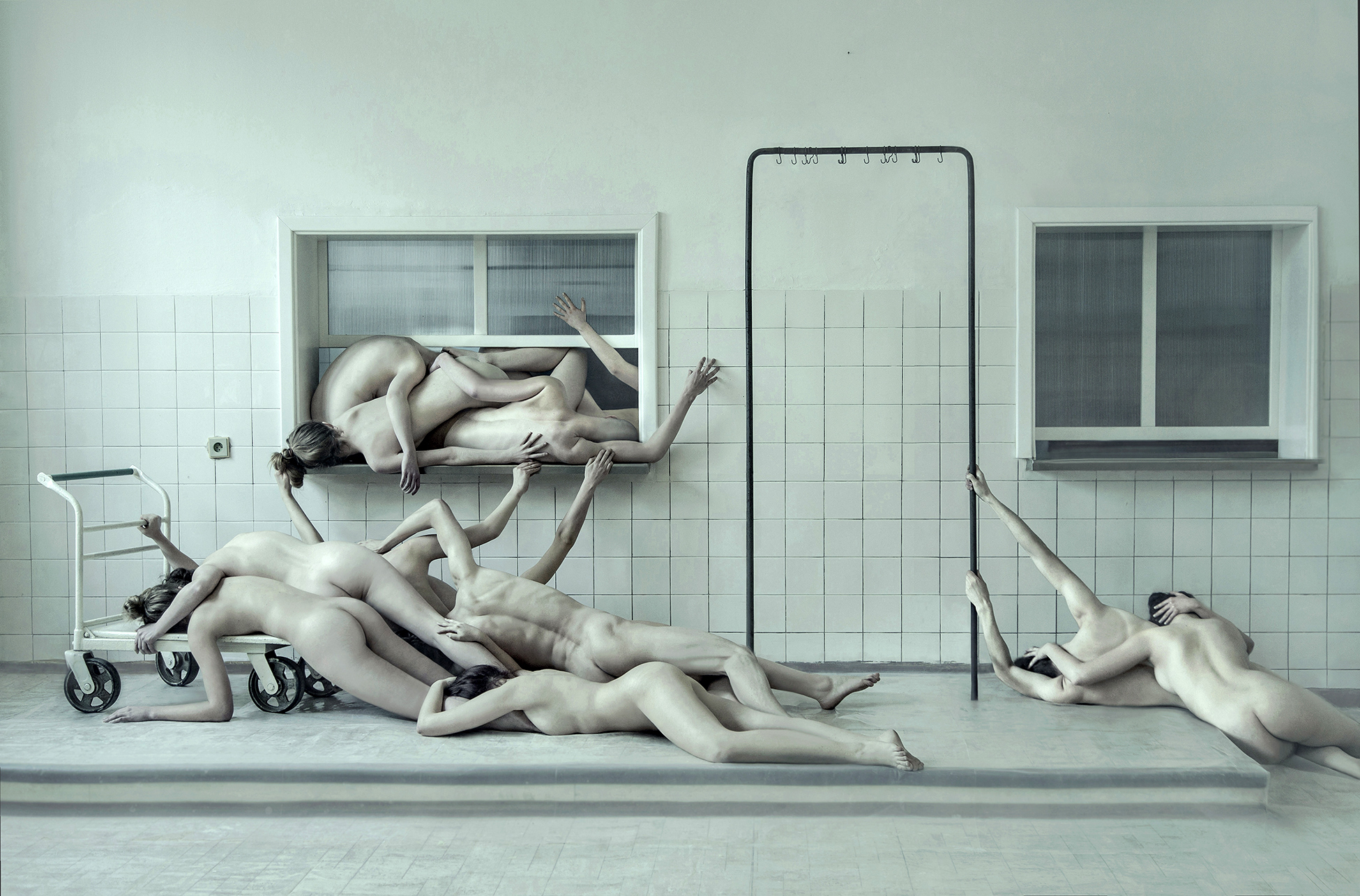 La obra suele estar bañada de una luz fría, blanco-verdosa que ilumina y dibuja los cuerpos envolviendo a unas figuras enigmáticas. No resulta fácil comprender qué ocurre en sus escenarios. Veamos, por ejemplo, este primer grupo de fotografías que corresponde a su serie «Ecce Homo». Cuerpos sin rostros, sin identidades, incluso sin una clara distinción de sexo, en un contacto asfixiante. Pudieran tener un carácter dramático pero no necesariamente. La autora confiesa que su mayor influencia pictórica viene de Géricault, el conocido autor decimonónico de «La balsa de la medusa». Los cuerpos apiñados y retorcidos la evocan, pero opino que más que dramatismo hay ensoñación, onirismo.
