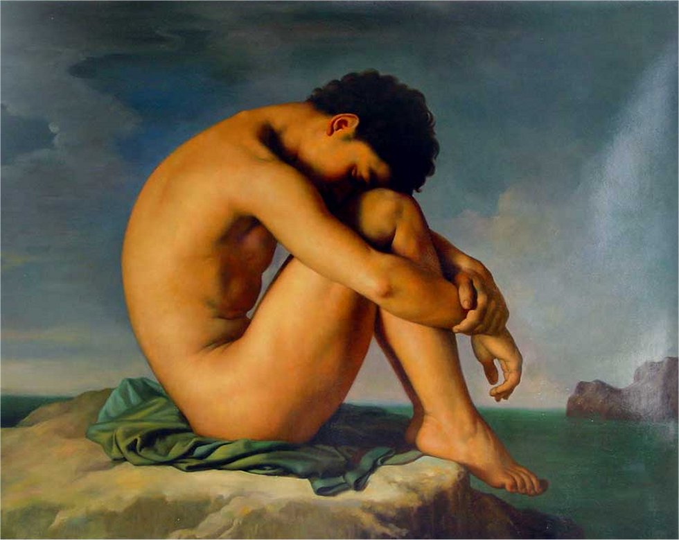En mi opinión, toda su obra respira una fuerte tensión contenida. Observemos, por ejemplo esta obra que es un homenaje al «Desnudo masculino sentado al borde del mar» de Flandrin.