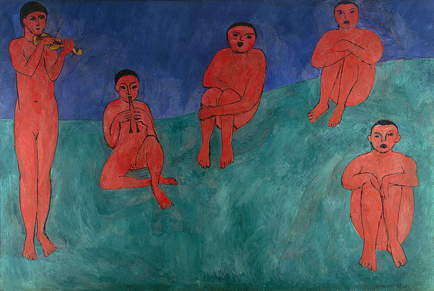 Lo vemos bien es estas tres extraordinarias obras, absolutamente clásicas. En «La danza», la más conocida de las tres, el dinamismo generado por las formas crea un espacio «real» pese a la ausencia de un modelado volumétrico de los cuerpos así como de cualquier elemento de perspectiva. El color ocre de las figuras contrasta fuertemente con el fondo azul-verde, complementarios, aislándolas del mismo y generando un espacio propio.