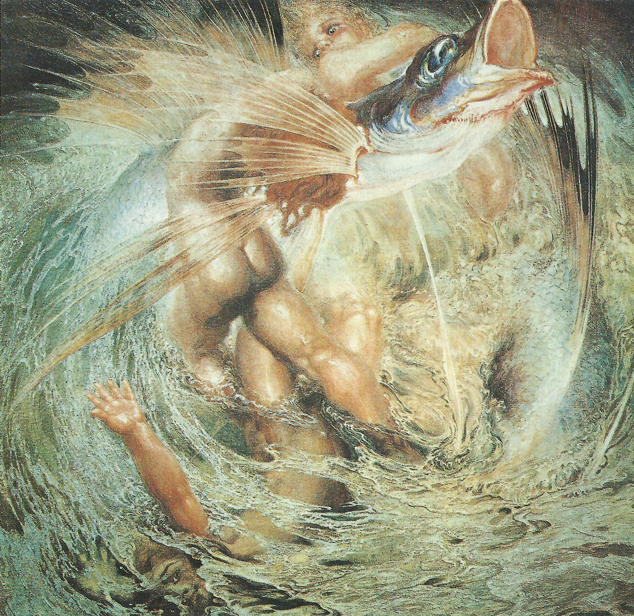 Inmensos peces pueblan un mundo onírico. No existe una clara distinción entre el fondo ornamental y la figura en una composición muy dinámica. Quizás la excepción sea la obra «Mar en reposo» donde la placidez parece asimilarse más a la muerte. Se comenta que esta obra tuvo gran influencia en Dalí. Los cuerpos, ahora de adultos flotan aparentemente inertes. La composición, triangular, sin el dinamismo de las anteriores, presenta una línea directora en zig-zag descendente hacia la cabeza de la figura del primer plano y parece intentar sumergirla. El equilibrio se mantiene por la presencia del gigantesco pez que contiene la caída. Una luz difusa lo invade todo y parece que baña de silencio la escena.