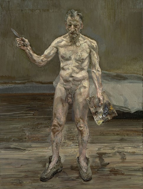 Hay que dar un salto temporal para pasar de Stanley Spencer a Lucien Freud (1922-2011). Muchas obras del primero pueden recordarnos a este nieto del célebre fundador del psicoanálisis. Sin embargo, existen muchos elementos que diferencian a estos dos grandes pintores. Freud centró su producción en el desnudo, un desnudo inquietante y nunca amable. Su paleta de colores, y muy particularmente su especial pigmento blanco, da un tono mortecino a las carnes. Los cuerpos parecen siempre ajados, envejecidos, vulnerables, ajenos a cualquier belleza formal. Como un primer ejemplo veamos este poco autocomplaciente autorretrato que pintó cuando tenía 71 años: