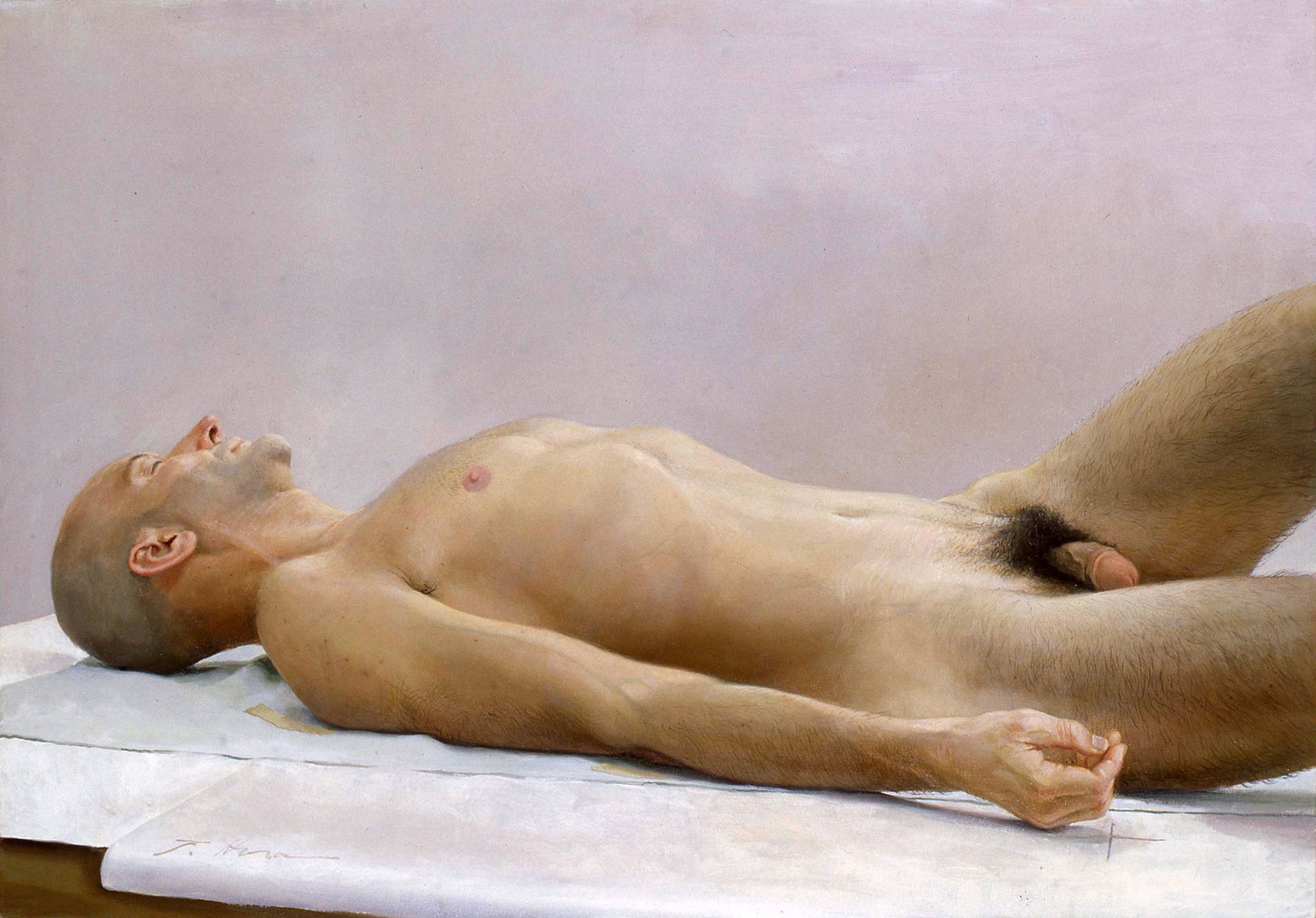 Antonio López (Tomelloso, España, 1936) es uno de los artistas más destacados del realismo fotográfico español. Su obra se la vincula frecuentemente al movimiento hiperrealista, aunque no tiene la dureza de Ron Mueck. Así vemos en este desnudo masculino -«Desnudo tumbado»- que, aunque también posee las dimensiones desmesuradas de este artista, permite la visión del material, sin falsear tonos y texturas. La mano del artista está presente.