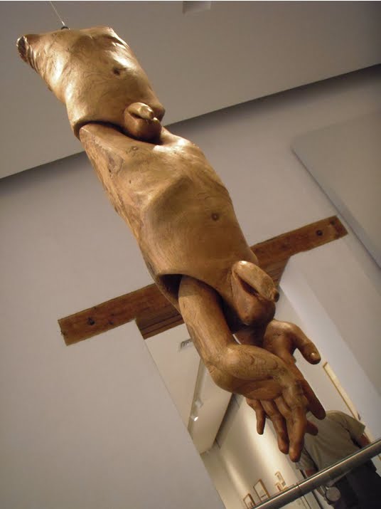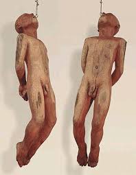 Sus cuerpos tallados (casi exclusivamente en madera) muestran usualmente una gran simplicidad formal, son bastante estáticos y los elementos expresivos se concentran en elementos del rostro.