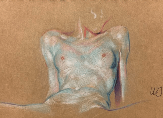 En sus dibujos, realizados a lápiz o pastel, dominan las figuras masculinas, mientras que la mujer, tratada de un modo más fragmentado, parece una referencia erótica en la mayoría de los mismos.