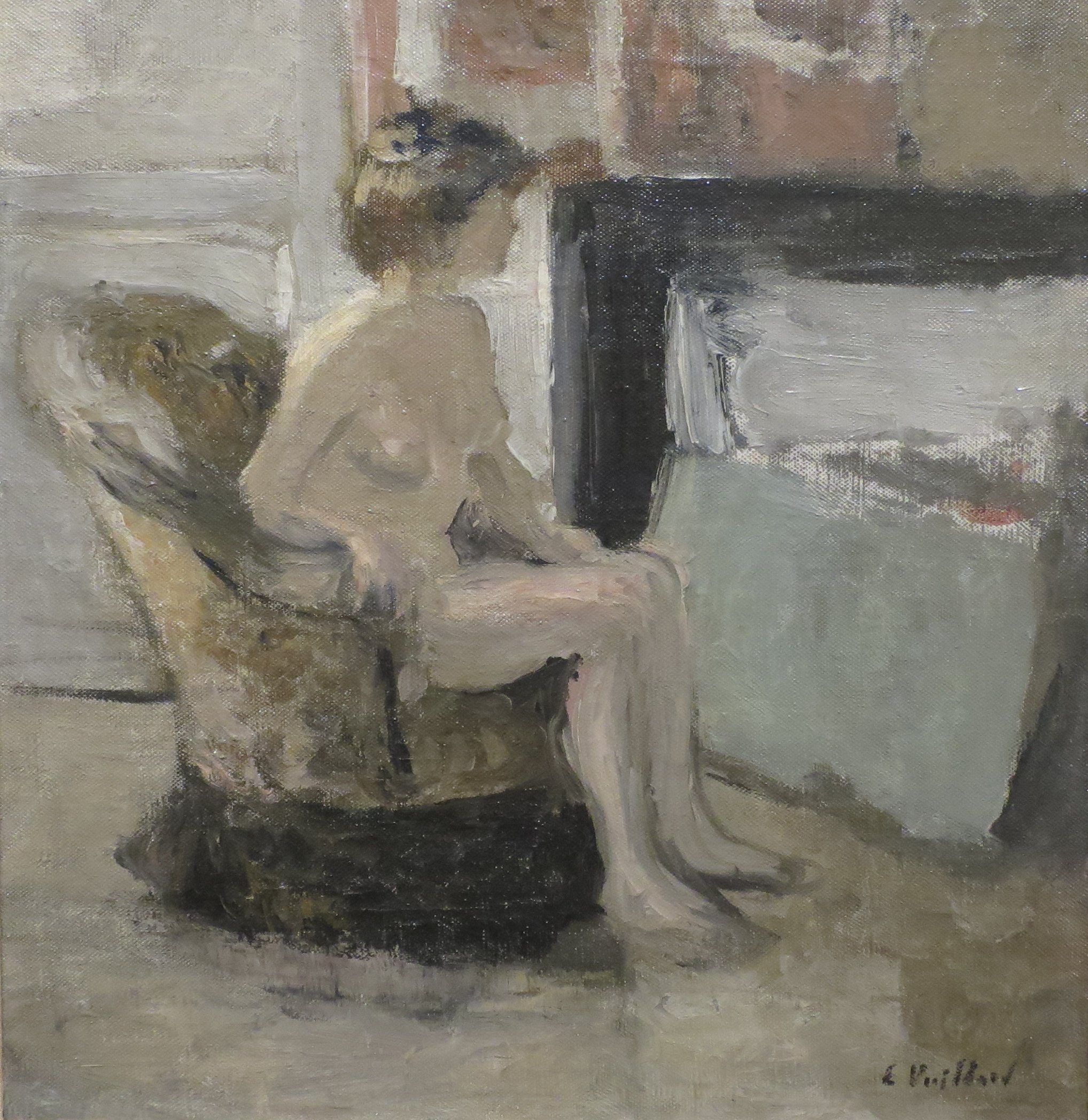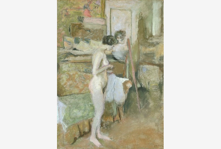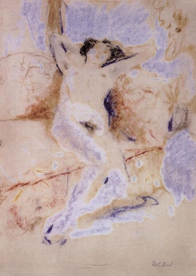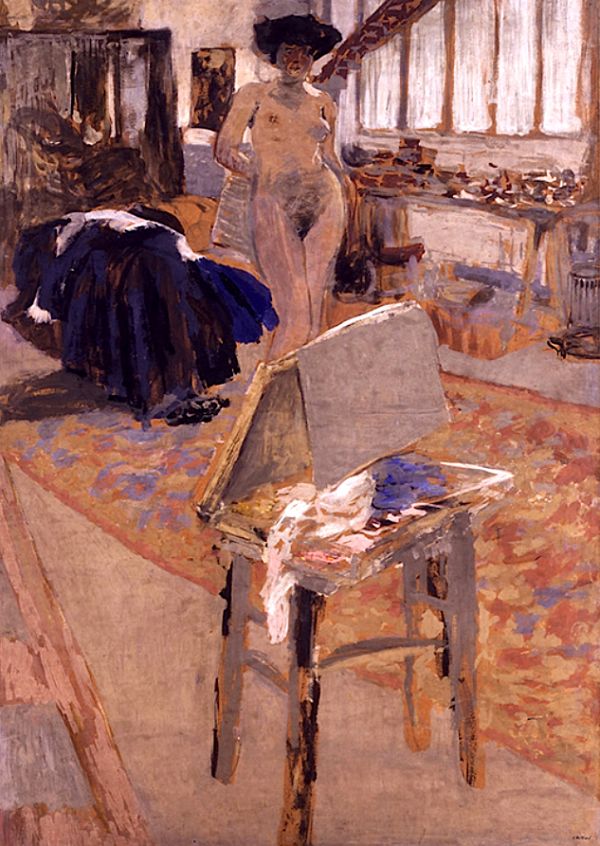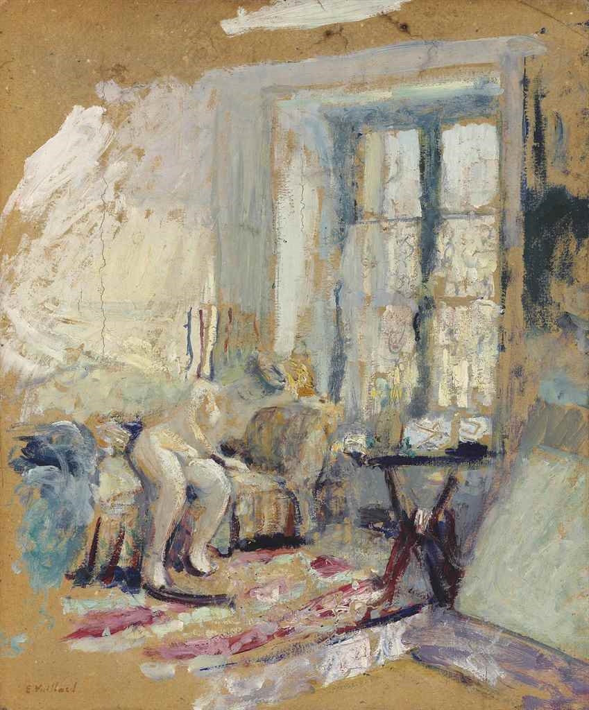 Jean-Édouard Vuillard (Cuiseaux, Borgoña, Francia, 1868-1940) fue uno de los miembros más destacados del grupo posimpresionista conocido como los «Nabis» («profestas» o «iluminados» en hebreo). Se trata de un pequeño grupo implantado sólo en Francia en los últimos años del siglo XIX que, bajo la influencia de la obra de Gauguin, presta una máxima importancia al color (colores planos fuertemente delimitados por trazos más oscuros) sobre cualquier naturalismo formal y con un gran interés decorativo. Los Nabis tomaron el relevo de los simbolistas y constituyeron el vínculo entre éstos y los expresionistas del siglo XX. A este movimiento pertenecen artistas ya comentados, como Félix Valloton, Paul Ranson, Pierre Bonnard o, en escultura, Aristide Maillol. Su estilo se fue suavizando hacia finales de su vida, retratando, en particular, escenas de la vida doméstica de la burguesía del momento. Ya, antes de finalizar el siglo había pintado interiores protagonizados por su madre, su hermana, y algunas obreras del taller de corsés en el que trabajaba la primera. Quizás sean éstas sus obras más famosas. Frecuentemente en estas obras las figuras y los fondos reciben el mismo tratamiento por un artista que, según se cita en un magnífico artículo del Musée D’Orsay, comentó: «Yo no hago retratos. Yo pinto a la gente en su casa«.