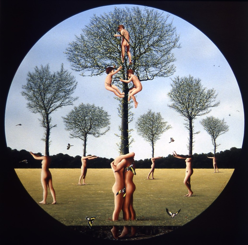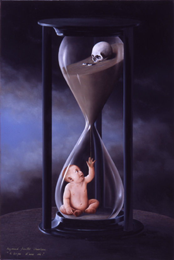 No resulta raro encontrarse, en esta época denominada postmoderna, un fuerte sincretismo artístico o una vuelta a viejos movimientos que dominaron el mundo cultural de la primera mitad del siglo XX. La obra de Raymond Douillet (Hautmont, Francia, 1947) se encuadra completamente dentro del surrealismo. Pese a que su estilo bebe de diversas fuentes, entre las que se incluye el arte renacentista italiano y el gótico centroeuropeo, creo que la huella de Duchamp o de surrealistas plenos como Paul Delvaux, con sus misteriosos y oscuros paisajes, o las arquitecturas de Giorgio de Chirico, han dejado una huella destacada en su obra. Se comenta una relación entre los términos verbales que designan, en francés e inglés los objetos representados, y la expresión artística de los mismos. También el paso del tiempo es uno de sus motivos recurrentes.