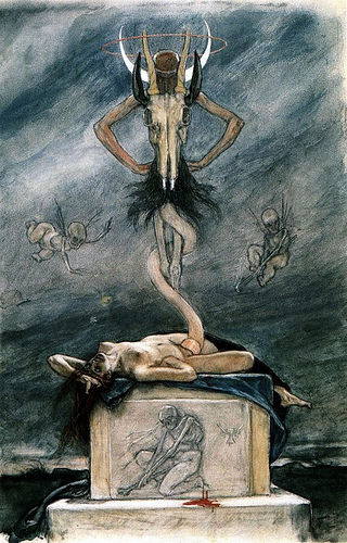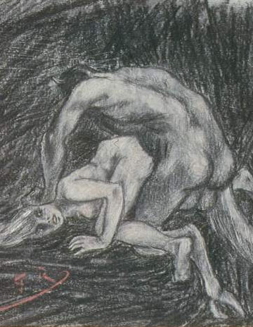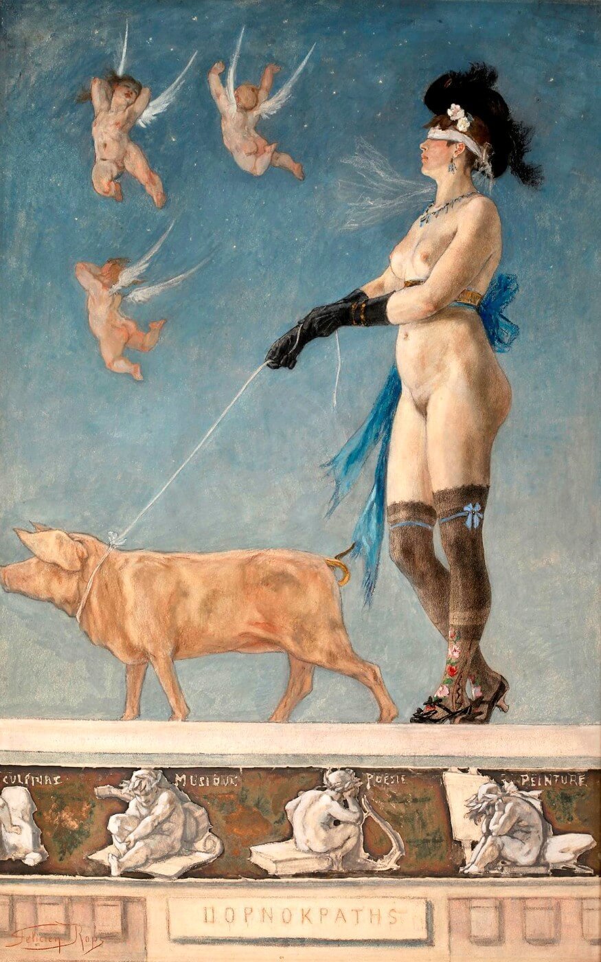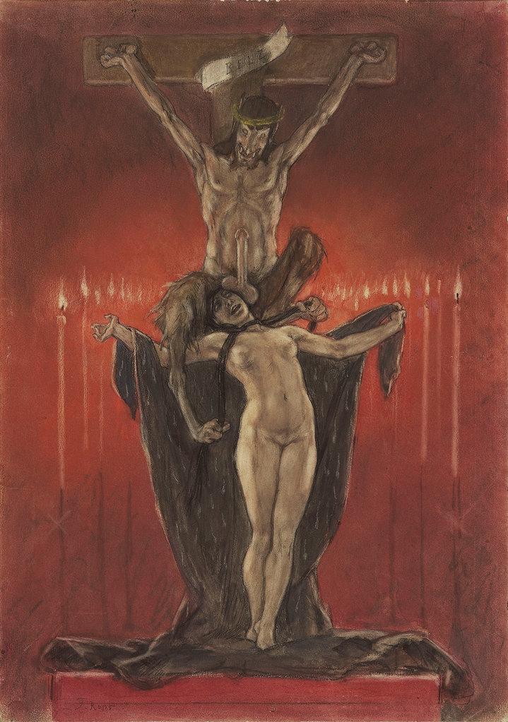 Félicien Rops (Namur, Bélgica, 1833-1898) se destacó, fundamentalmente, como dibujante, caricaturista y grabador. Fue miembro fundador del denominado Grupo de los XX que, en Bélgica, intentó luchar contra el academicismo y el esquema de comercialización artística imperante. Este grupo formado por veinte artistas que invitaban anualmente a otros veinte (usualmente extranjeros), permitió la intercambio de ideas entre distintos grupos artísticos (postimpresionistas y expresionistas, fundamentalmente). Conoció a Baudelaire e ilustró algunas de sus obras en las que el sexo, la muerte y el satanismo cobran protagonismo.