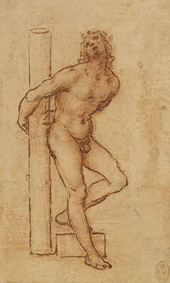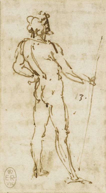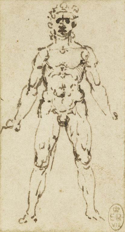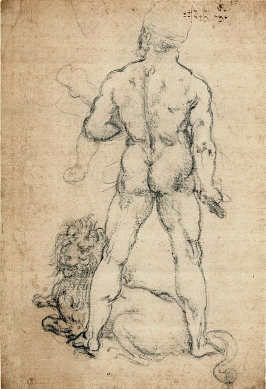 Leonardo da Vinci (Vinci, antigua República de Florencia, Italia, 1452-1519) es indiscutiblemente uno de los grandes genios de la cultura mundial y uno de los representantes máximos de la concepción humanística del hombre renacentista. Pintor, escultor, dibujante, arquitecto, ingeniero, anatomista, poeta… Lo abarcó todo. Dentro del mundo artístico establece con Miguel Angel y Rafael la trilogía más representativa del Quattrocento italiano. Su obra pictórica, pese a su extraordinaria importancia, no es abundante y sólo conozco una obra suya en la que se muestre un desnudo: Leda y el cisne, de la que no se conserva el original. Sabemos que realizó esculturas pero tampoco se han conservado; quizás con la excepción de una «Virgen con niño riendo» atribuída recientemente al Maestro. Pero sus dibujos son numerosos. Se conserva una gran colección en las que el desnudo se utiliza tanto con fines anatómicos como artísticos. Son casi exclusivamente desnudos masculinos. Leonardo da Vinci era homosexual y a los 24 años fue acusado de sodomía, pero este hecho no parece plasmarse de ninguna forma en su arte. Técnicamente, entonaba el papel utilizando varios materiales diluídos (tinta, carboncillos, sanguina, etc.) lo que le permitía luego generar sombras y luces que daban aspecto tridimensional a sus figuras. La pintura se llevaba a cabo con plumas de ganso endurecidas, y la tinta se fabricaba con gallaritas, sulfato férrico y goma arábica.