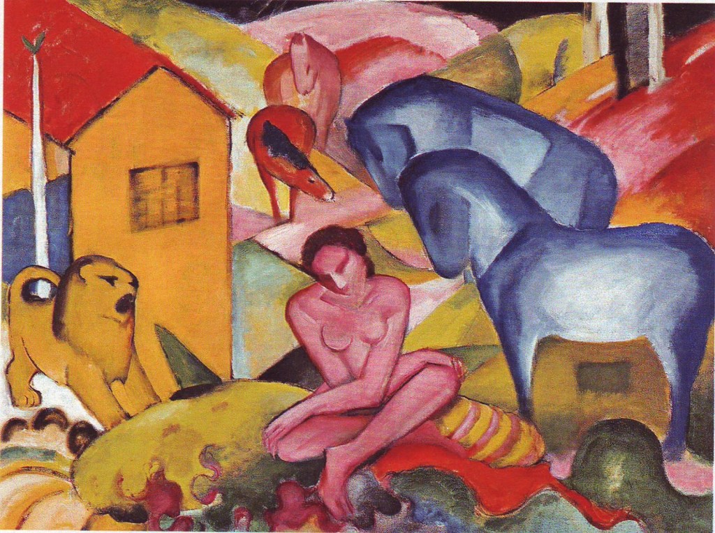 Algunos críticos comentan que rechazaba la figura humana – al considerar al hombre indigno de ser retratado – pero me he encontrado con muchos desnudos, por lo que seguramente habría que matizar estas afirmaciones. Un colorido intenso, inspirado por Robert Delonay, con clave simbólica: rojo (violencia), amarillo (alegría femenina) y azul (espiritualidad y austeridad masculina), aunque creo que tampoco podemos ser rígidos en esta apreciación.