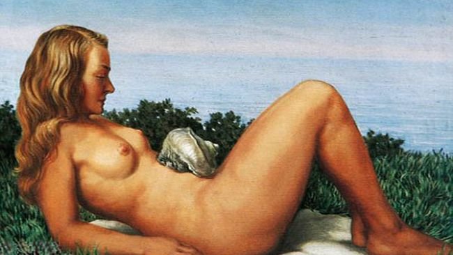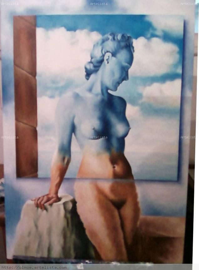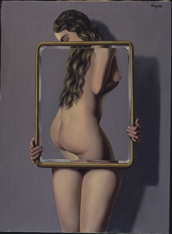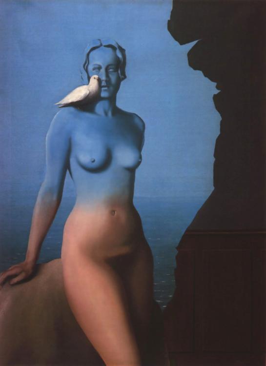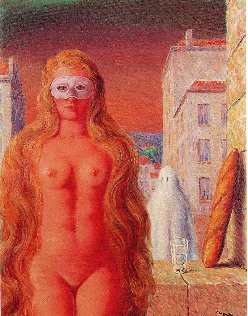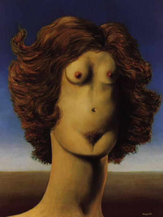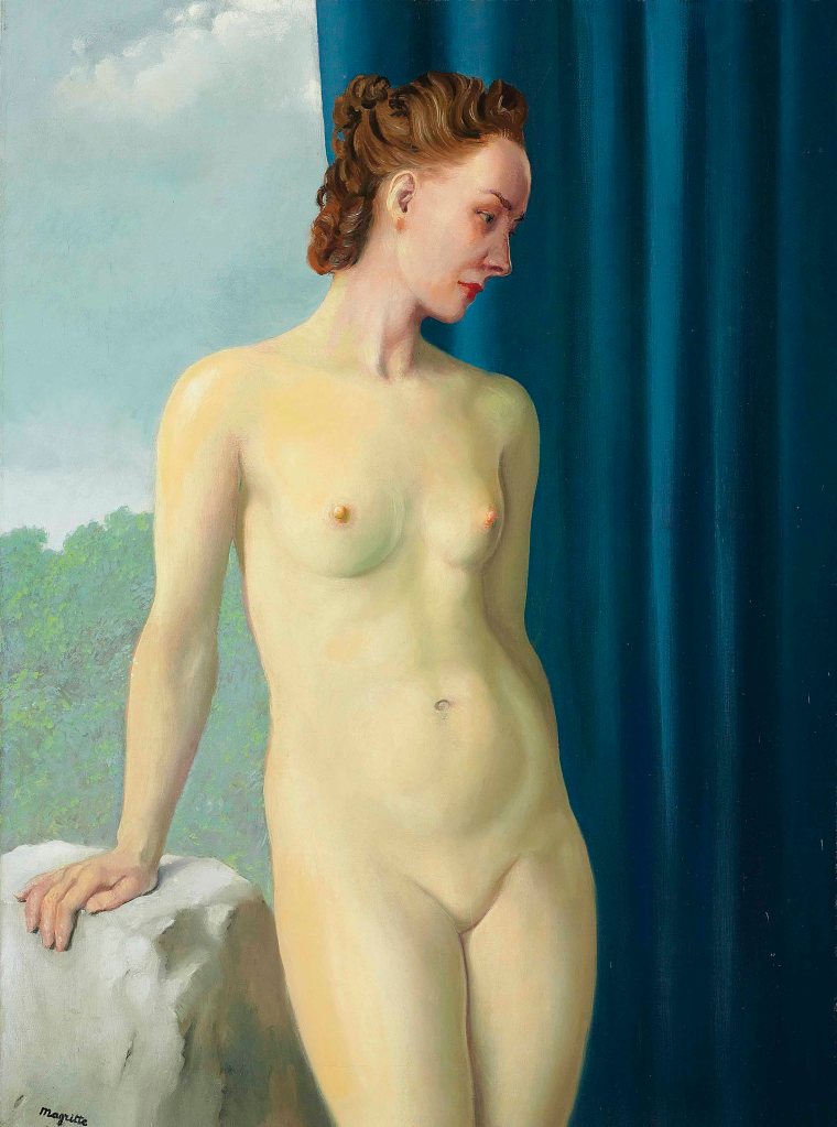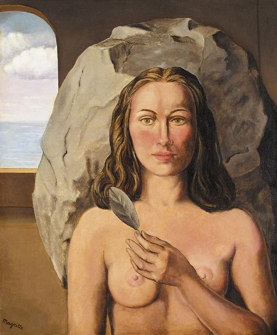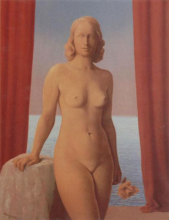 Sin embargo, cuando pensamos en Magritte, se nos viene a la cabeza su extraño mundo simbólico en el que cuestiona las formas de percepción y el uso del lenguaje. La iluminación nocturna y diurna, simultaneadas, y el trampantojo generado por la superposición de la realidad y la representación de la misma. Un mundo onírico basado en la incongruencia de unos elementos que no tienen cabida en el mundo real pero que podemos apreciar como coherentes en un sueño. Estos hechos se aprecian menos en los desnudos que les quiero mostrar pero siempre están presentes. El cambio hacia este nuevo estilo surgió en esos años veinte, cuando conoció la obra de Giorgio de Chirico. Ya, a finales de la década, entró en contacto en París con los surrealistas franceses, con su «gran jefe» Bréton, y con los españoles Dalí, Miró y Arp.