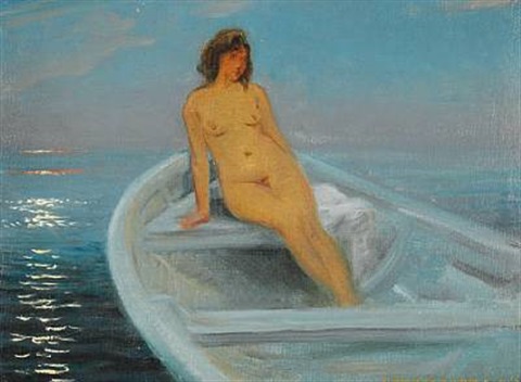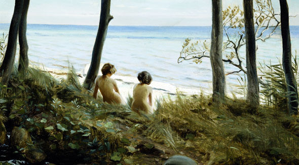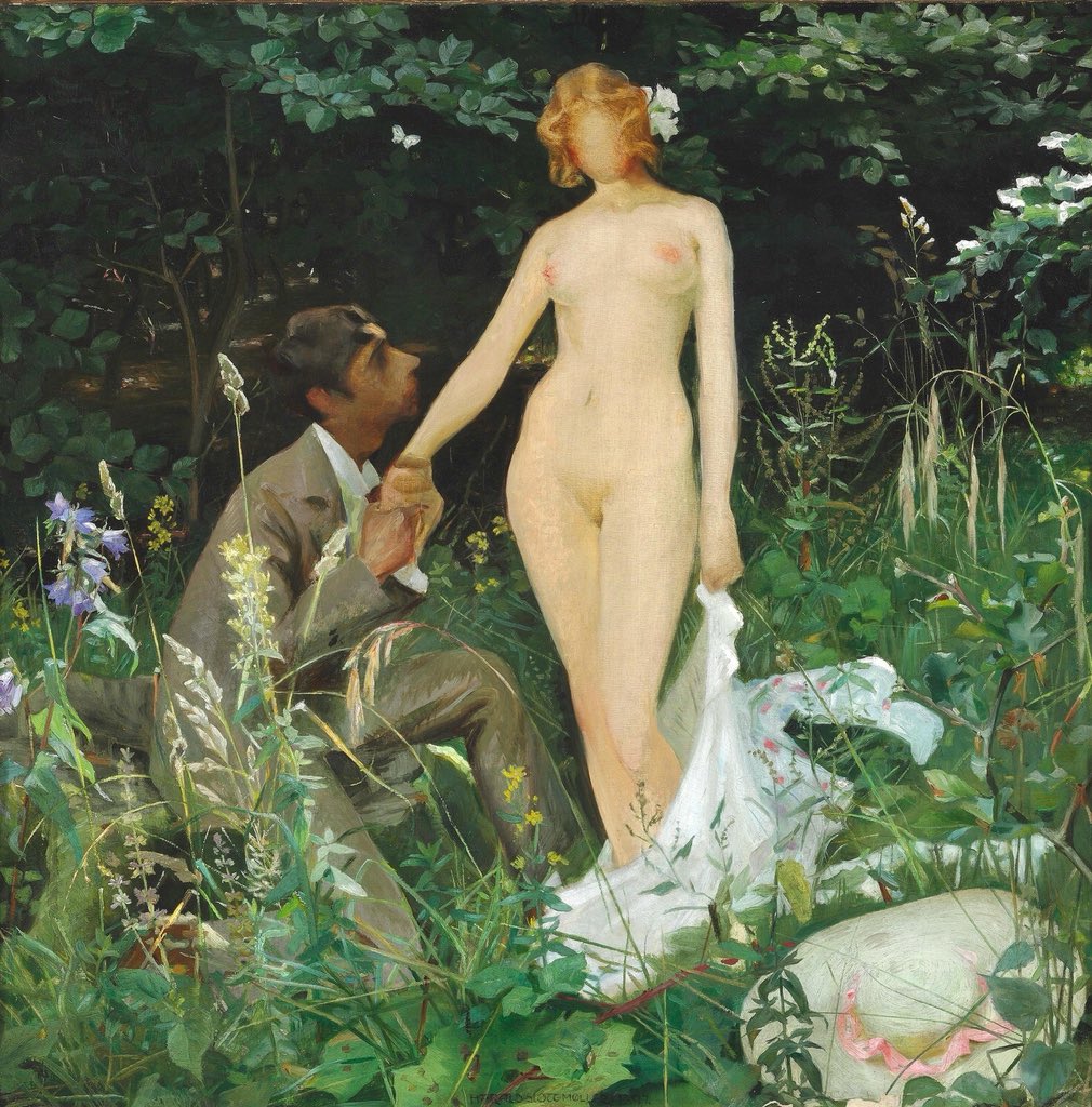 Harald Slott-Møller (Copenhague, Dinamarca, 1864-1937) fue un pintor y escultor educado dentro del realismo danés gracias a un curso preparatorio en la Academia de Arte de Copenhague y, posteriormente, del pintor impresionista Peder Severin Krøyer que tutorizó, durante algunos años, su obra. A su pintura se la encuadra dentro del simbolismo, y en algunos desnudos, como el «Adán y Eva» – con el que inicio esta presentación – este estilo se pone de manifiesto claramente. En otros casos, no se evidencia tanto y observamos un continuo realismo-impresionismo-simbolismo más difícil de clasificar. El artista formó parte del grupo fundador de «La Exposición Libre», un colectivo que tuvo carácter reivindicativo pero sin aunar artistas con el mismo estilo.