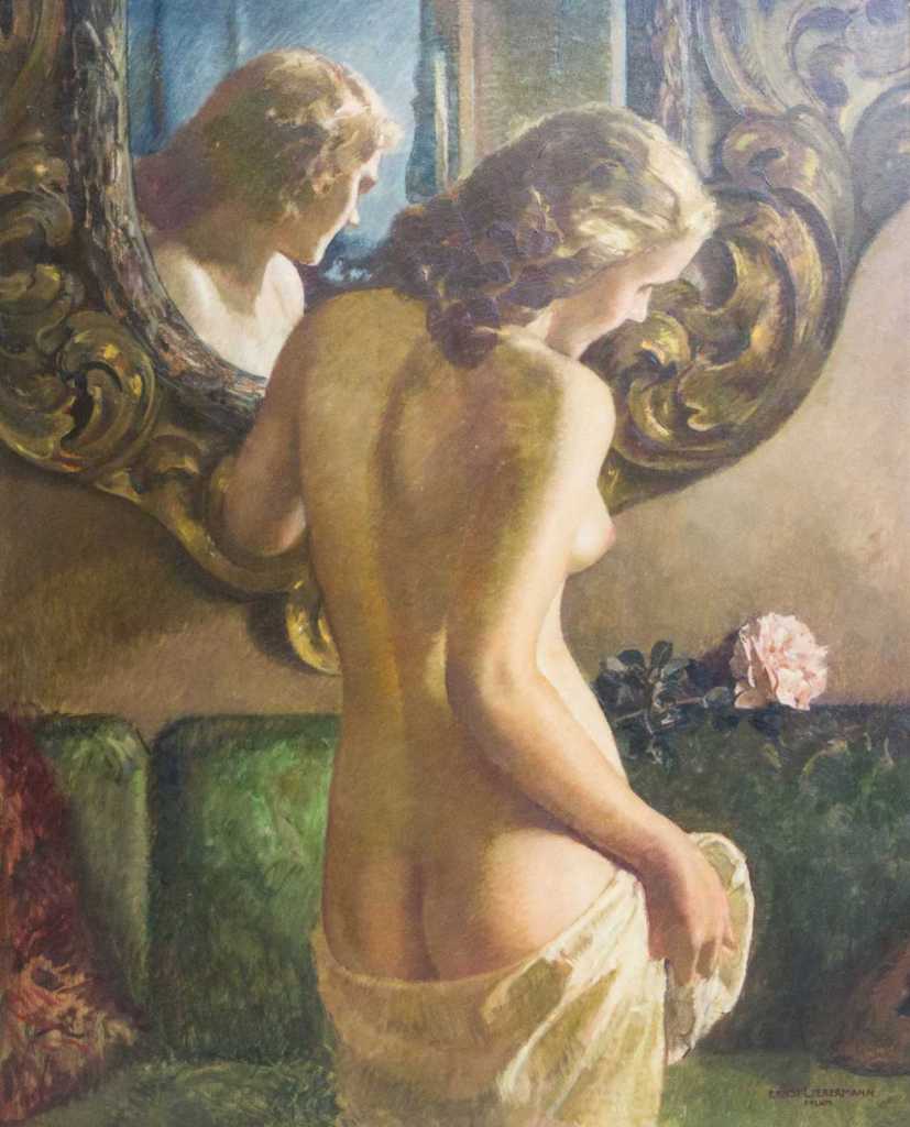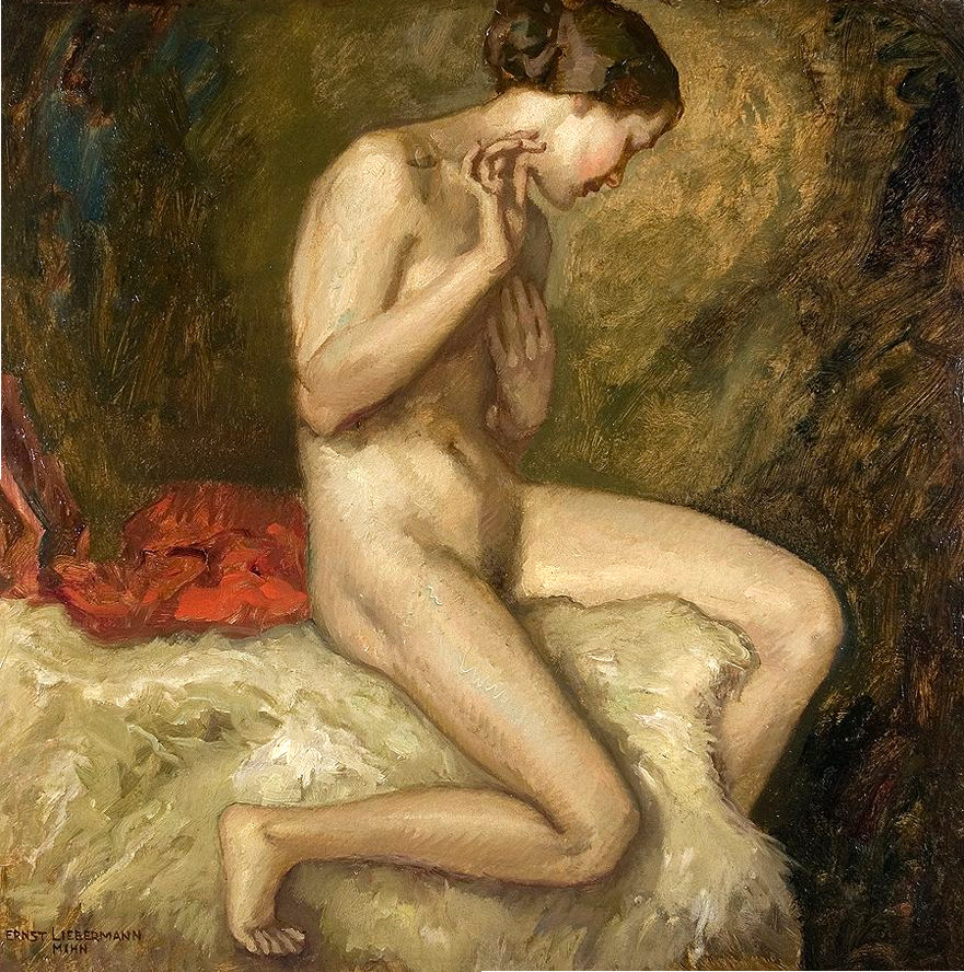 La obra de Ernst Liebermann – como la de Max – se ve influenciada por el impresionismo y el modernismo/simbolismo pero, de algún modo, también pone de manifiesto alguno de los valores (salud física y deporte, familia, raza, etc.) que defendía el nazismo. No fue represaliado por éste, como todos los artistas que el régimen consideró que producían un «arte decadente» y, quizás este hecho ha contribuído a una menor difusión de su obra. Berthold Hinz en un estudio que aparece en el catálogo de la magna exposición «les Realismes, 1919-1939» – llevada a cabo por el «Centre George Pompidou» en 1981 – es extremadamente crítico con el arte del IIIº Reich al que acusa de un mantenimiento de los estereotipos a través de una pintura de género, ajena tanto a la temática social real como al conjunto estilístico de las vanguardias. Ernst Libermann no creo que haya sido un modelo del pintor del nazismo, como quizás lo fuese Ivo Saliger o Adolf Ziegler, y muchos de sus desnudos considero que deberían formar parte de una antología del arte modernista. Aquí les muestro algunos: