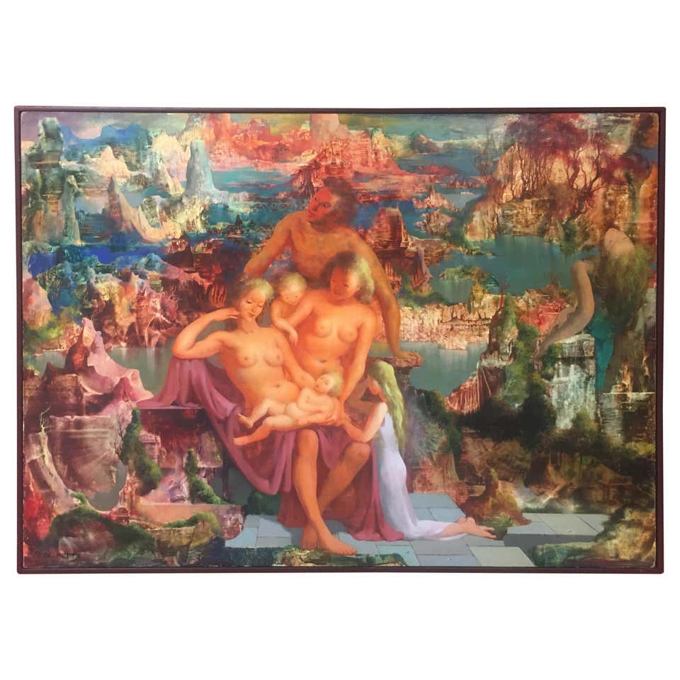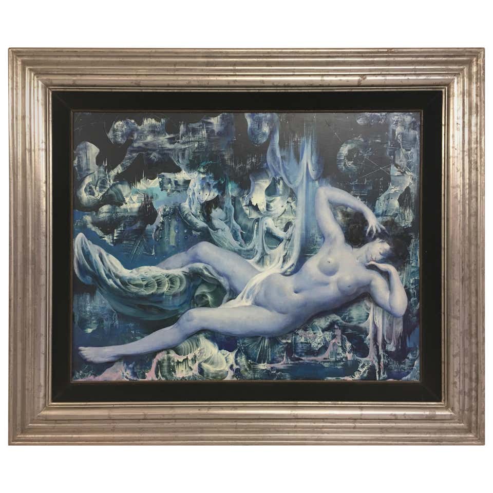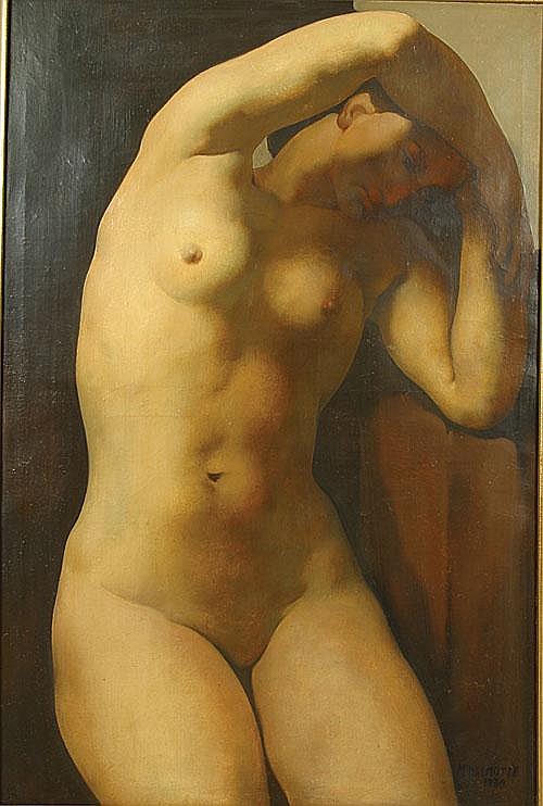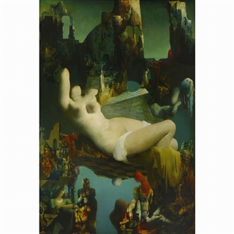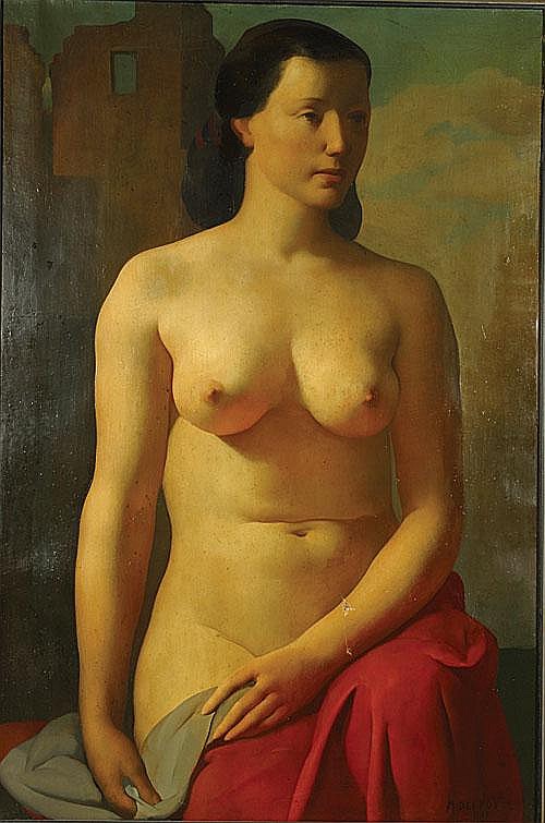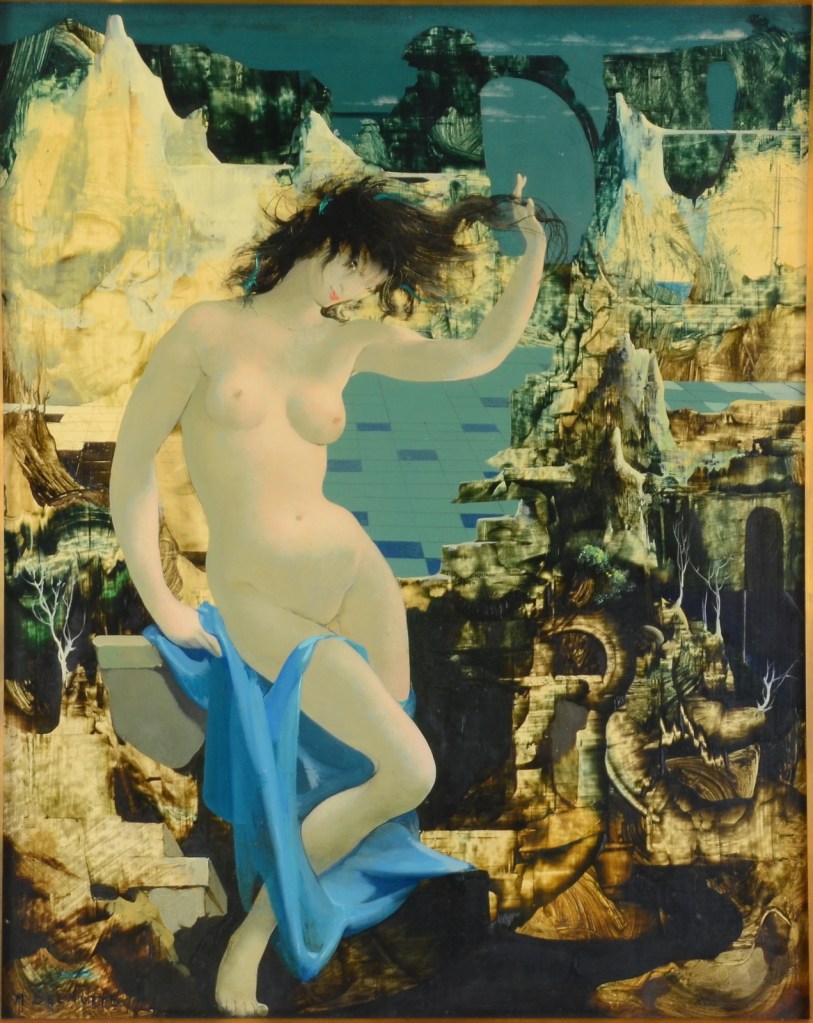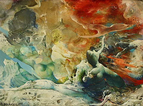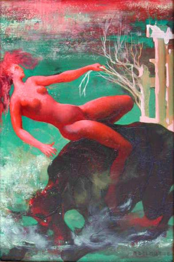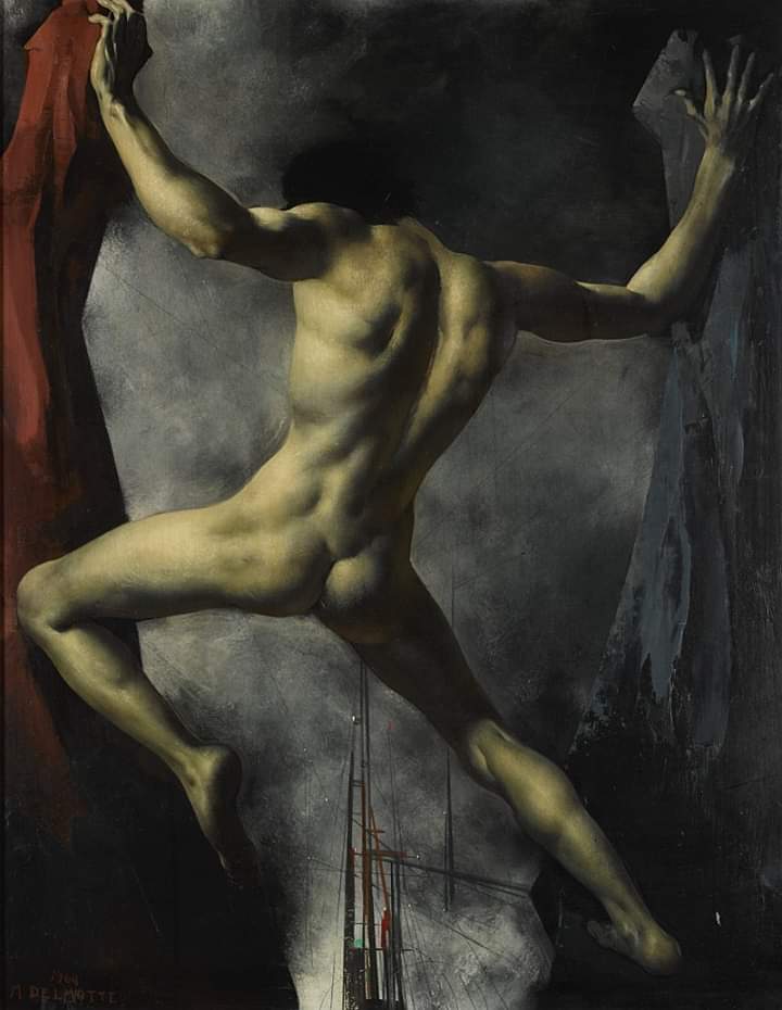 Marcel Delmotte (Charleroi, Bélgica, 1901-1984) fue un artista en cuya obra se aprecia una transición del simbolismo hacia el surrealismo. De formación autodidacta, sus continuas visitas a museos y exposiciones, le aportaron un buen conocimiento del arte clásico y algunos artistas tales como Piero della Francesca, Caravaggio, Poussin o David, dejaron su impronta en la obra de este artista. De un modo muy destacado, hay que citar al surrealista Giorgio de Chirico. Menos conocido que otros surrealistas belgas, como Paul Delvaux o René Magritte, o que el simbolista Jean Delville, generó – en mi opinión – un estilo que no terminó de decantarse por ninguno de los ismos del momento. Algunas de sus obras como «Atlas» o «las columnas de Hércules» me recuerdan al «Prometeo» o a «los últimos ídolos» de Delville: