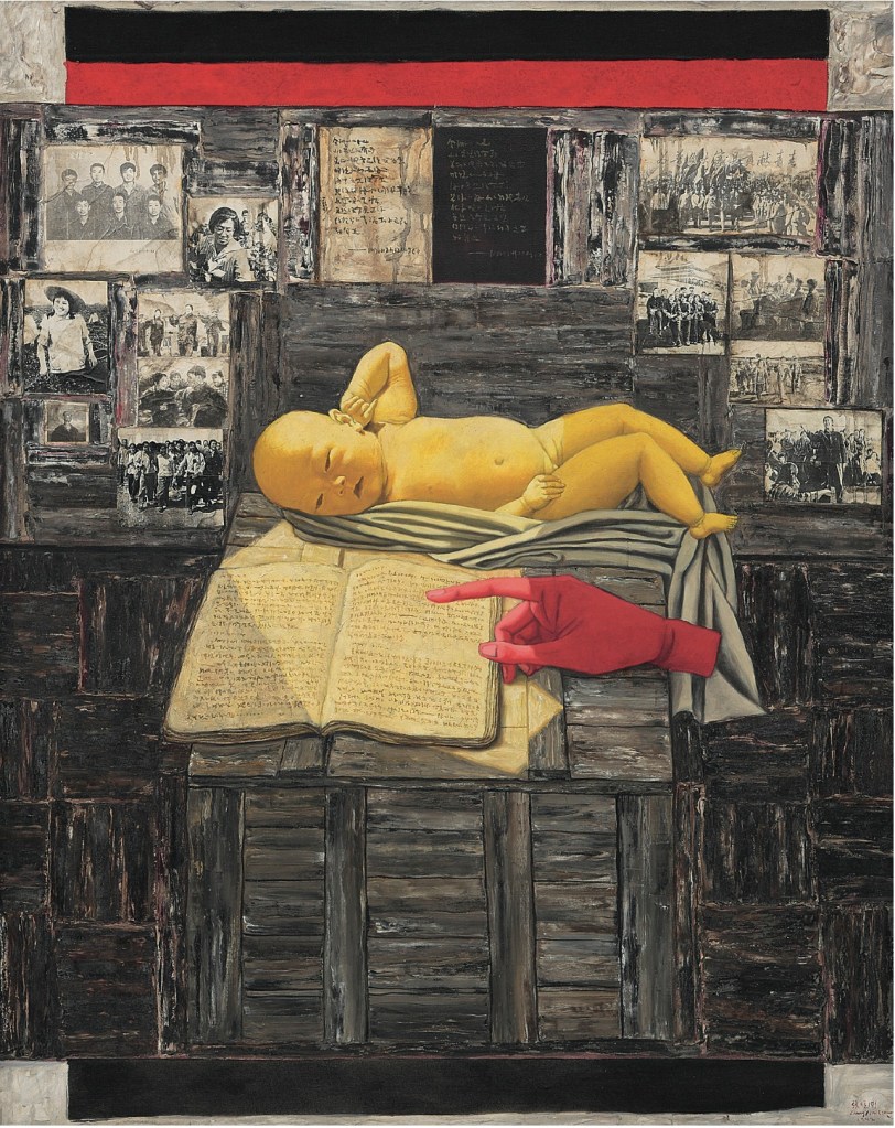 Pero, a principios de los 90, la obra cambió drásticamente. Series como Bloodline ponen a la familia en primer plano y el desnudo se circunscribe al ámbito infantil, con un fuerte carácter simbólico. Se juega a un esquema que tiene su base en la manipulación fotográfica, con fuerte influencia del fotógrafo germano Gerhard Richter que estuvo en China. La obra adquiere fuerte carga ideológica y los niños – verdaderos protagonistas -parecen mostrar la contribución de las nuevas generaciones a un nuevo país, que se integra en el mundo tradicional de sus mayores. No me resulta fácil entender el mensaje de las mismas, pese a los comentarios del autor en una entrevista para PHILLIPS. Podemos observar cómo los medios de comunicación, de todos los tipos, parecen mostrar su influencia sobre este proyecto de nuevo mundo. Por ello, pienso que es una obra más ideológica o filosófica, que política.