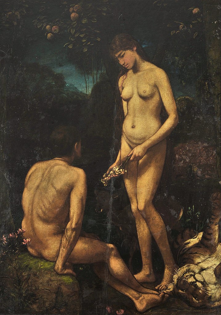 Entre los maestros alemanes del siglo XIX, cabe destacar la figura de Hans Thoma (Bernau, Alemania, 1839-1924). Pese a su amplia formación en Alemania, Italia y Francia, se mantuvo, en gran medida, ajeno a las corrientes artísticas del momento, mostrando un mayor interés por las tradiciones de su tierra y, de un modo muy particular, por la obra de Altdorfer y Lucas Cranach el Viejo. En su obra (pintura, grabado y dibujo) abundan los temas mitológicos y, fundamentalmente, religiosos. Les muestro una selección de sus desnudos, que inicio con varias de sus versiones de Adán y Eva: