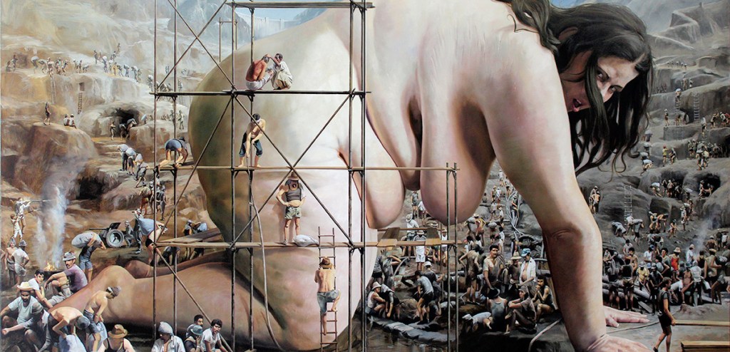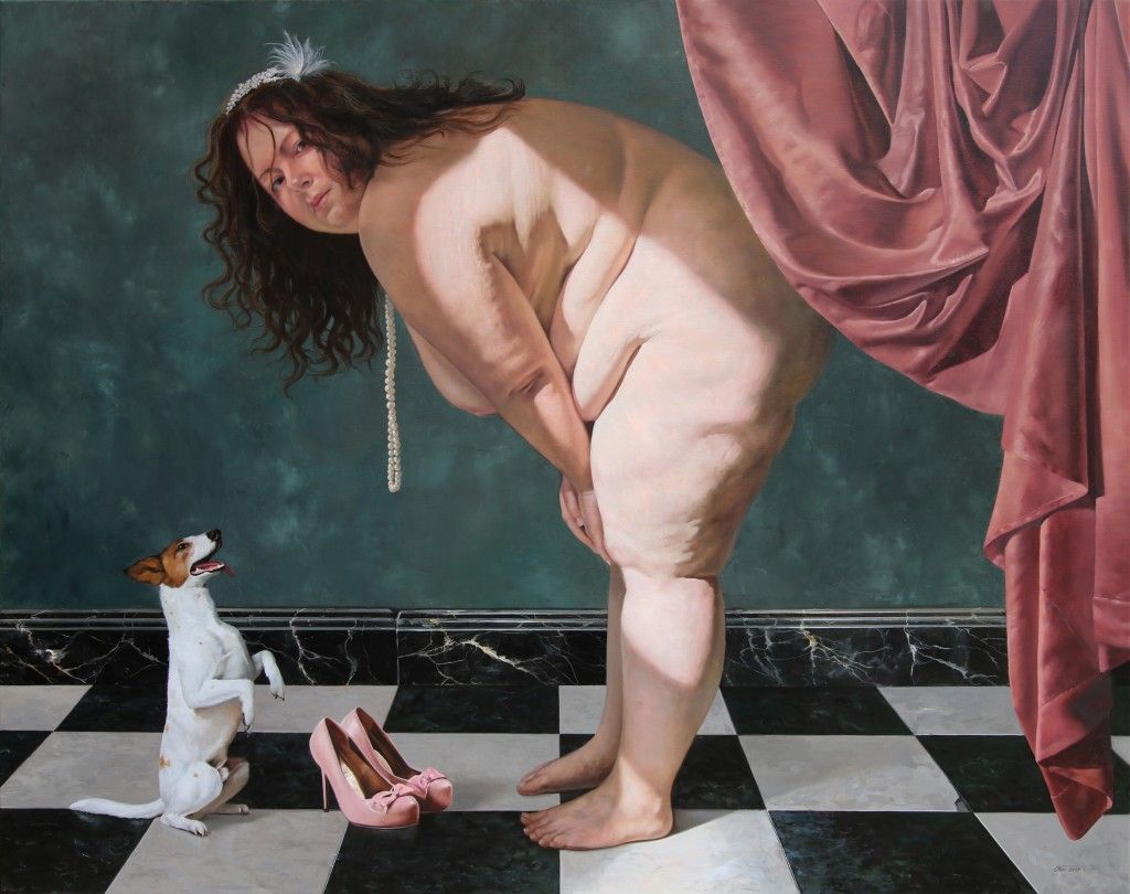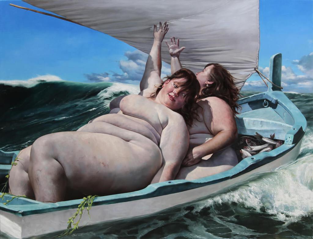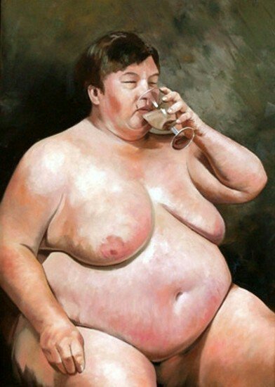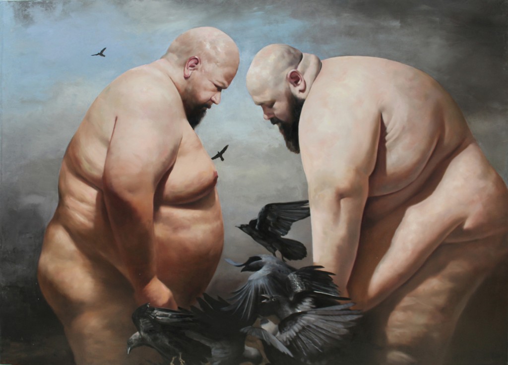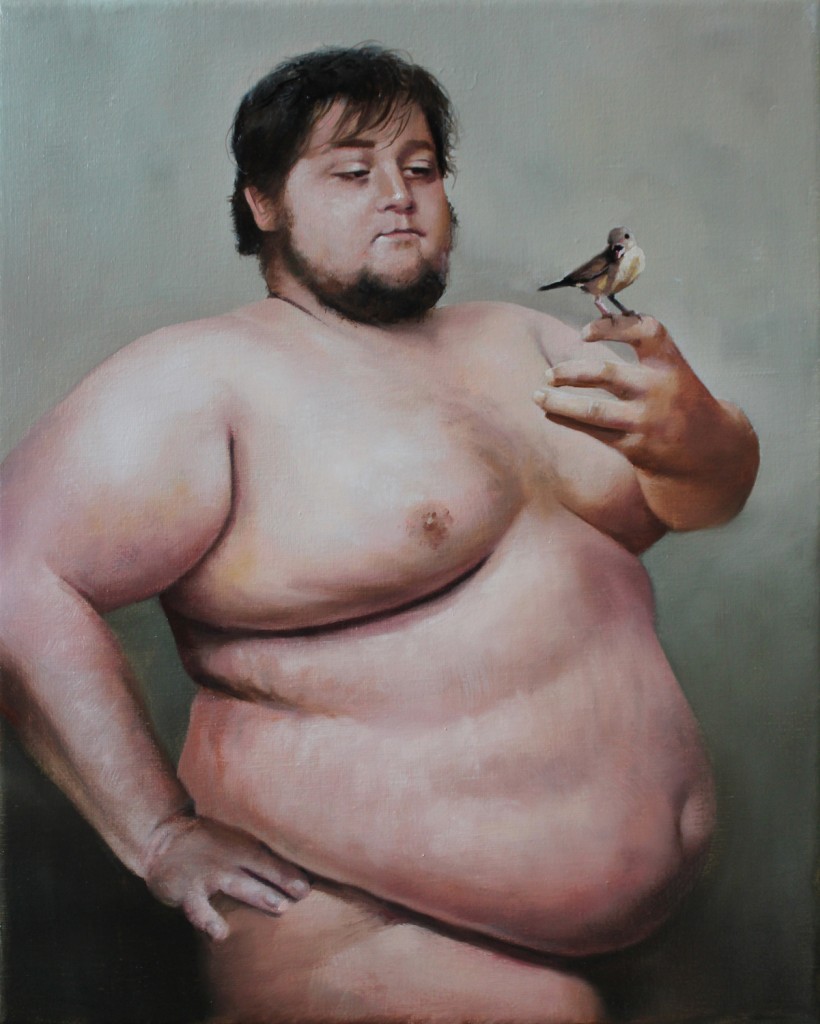La obesidad en el arte puede abordarse desde distintas ópticas. Rubens la mostró asociada a una estética cuya base era la prosperidad económica. De un modo similar, pero con una visión negativa asociada a una ideología política, podemos observar los gordos de Mu Boyan. En el mundo occidental resulta fácil identificarnos con las figuras amables de la mayoría de las obras de Botero. Rolf Ohst (Lübeck, Alemania, 1952) nos plantea una obra con abundantes desnudos tratados con un técnica asociable al hiperrealismo pero, dentro de los mismos y – aunque pueda parecer contradictorio – aparecen figuras de obesidad extrema y dimensiones ocasionalmente gigantescas. Una desmesura similar a la comentada de Mu Boyan pero donde no se plantea ningún tipo de crítica. Los voluminosos personajes masculinos, que se contrastan con el pequeño tamaño y fragilidad de un pájaro, parecen responder a una idea de autoconfianza y felicidad. Les muestro éstos (serie Birdy) y otros ejemplos.