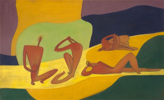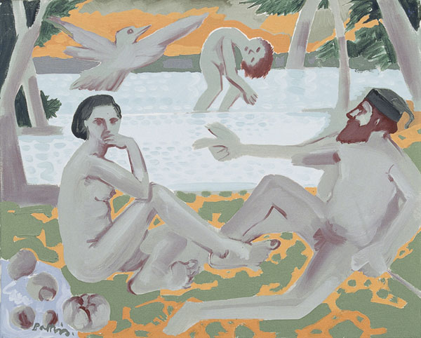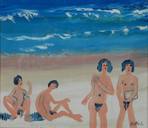 Walter Battiss (Somerset East, Sudáfrica, 1906-1982) fue un artista destacado que creó, en la época del apartheid, un mundo original y exclusivo – con sus propias reglas y estructuras – que denominó «Fook Island». El artista viajó, durante los años 60 y 70 por numerosas islas como las griegas o las Seychelles con las que elabora posteriormente ese espacio personal que le dará renombre internacional. Quizás por ello, su obra se la ha encuadrado dentro de un indigenismo del que estuvo siempre muy interesado pero que, globalmente, no creo que refleje la totalidad de su obra. Ateniéndonos, como siempre, a los desnudos, podemos ver algunas reinterpretaciones de obras clásicas del arte europeo, como son las que utilizo para abrir esta pequeña exposición de sus trabajos.