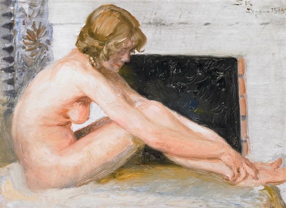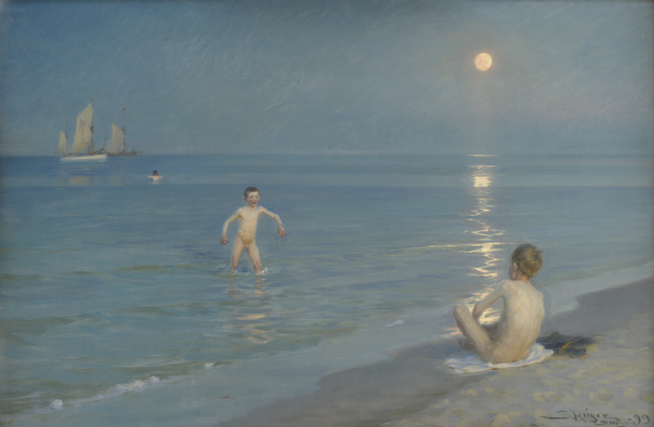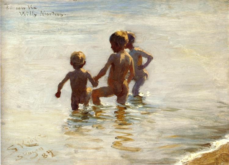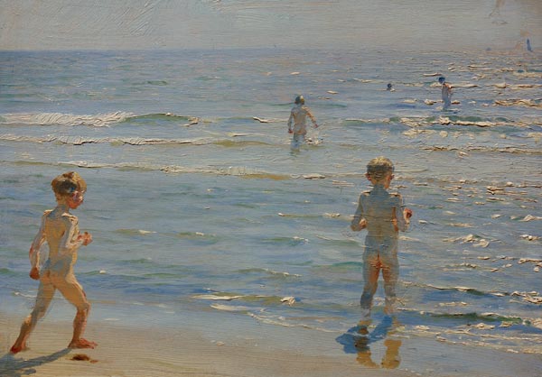 Peder Severin Kroyer, o P.S. Kroyer (Stavanger, Noruega, 1851-1909) es quizás el pintor más destacado de la comunidad de Skagen. Podemos considerarlo tanto un pintor danés como noruego, pues Stavager, aunque es una localidad noruega, es fronteriza con Dinamarca, a la que pertenece Skagen. En esta última hemos visto que se reunió una comunidad artística importante cuyo objetivo fue la representación de la luz y el color; un impresionismo nórdico con influencias francesas. De hecho, Kroyer dió clase en París con Léon Bonnat y conoció a Manet, Monet, Renoir, Degas y Sisley. En sus composiciones no abundan las desnudos y, cuando los encontramos, nos muestran un mundo infantil, de niños jugando en la playa que hace que, al menos para los españoles, P.S. Severin pueda considerarse un Sorolla nórdico. Sus desnudos no parecen guardar mucha relación con los de – la que fue su esposa – Marie Kroyer, que acabamos de comentar.
