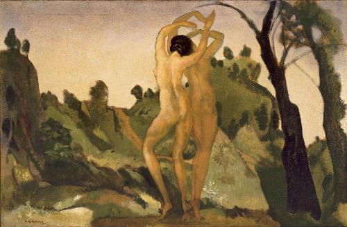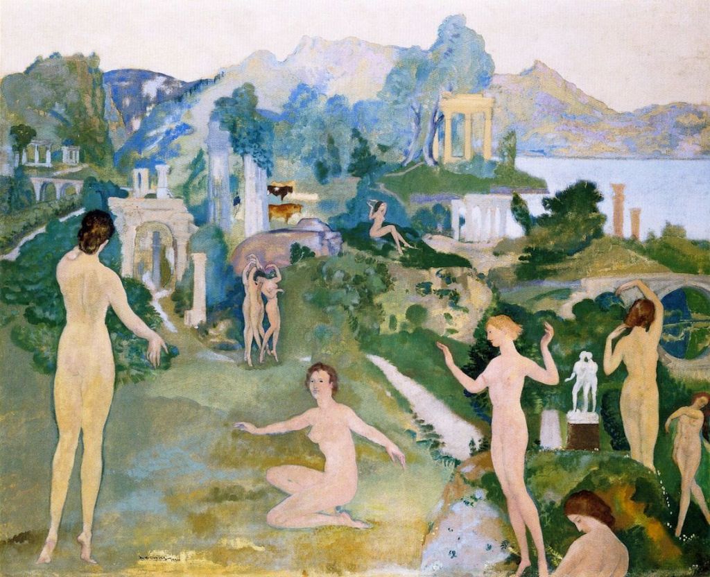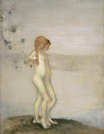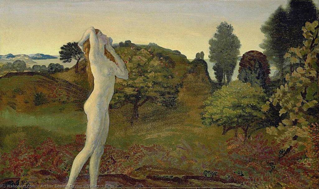 La figura de Arthur B. Davies (Utica, Nueva York, USA, 1863-1928) es singular. Wikipedia nos comenta su curiosa vida matrimonial con la médica Virginia Meriwether, pero también resulta muy original su producción pictórica, que es lo que nos interesa aquí. David se vio inicialmente fascinado por las pinturas realistas holandesas, que conoció por sus frecuentes viajes a Europa, pero desarrolló una obra basada en figuras lánguidas, próximas a los prerrafaelistas. Formó parte del grupo realista americano conocido como «Escuela de Ashcan» o «The Eight», que ya comentábamos en el caso de otra figura del mismo: John Sloan. Se contrapone en cierto modo su pintura a las vanguardias europeas que, como principal impulsor de la gran exposición Armory Show de 1913, pretendía mostrar al público americano. Arthur B. Davies tenía la reputación de ser un verdadero experto en arte contemporáneo, y se vió influido durante un cierto tiempo con el colorismo y las formas cubistas europeas. No sabemos qué pasó. Quizás no tuvieron esas obras la aceptación deseada del público, y el artista volvió a su pintura inicial.