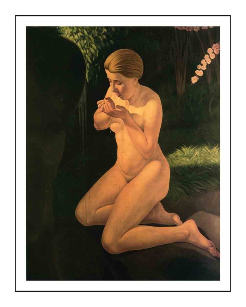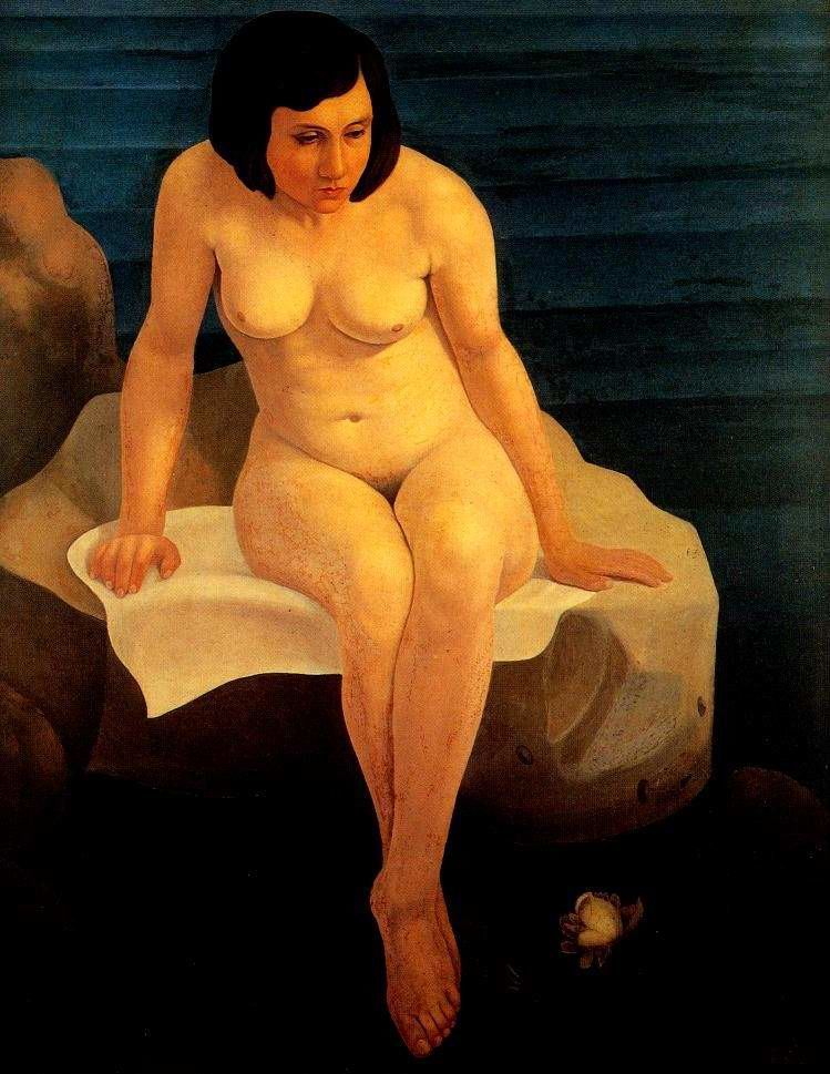 Natale Bentivoglio Scarpa, que se hizo cambiar el nombre por el de Cagnaccio di San Pietro (Desenzano del Garda, Lombardía, Italia, 1897-1946) fue un pintor realista del que no conozco muchos desnudos, pero los que he podido encontrar son verdaderas obras maestras. Parece ser que la primera etapa del pintor fue futurista. En los años veinte dio paso a un realismo de tipo expresionista – en tanto que intenta reflejar los conflictos de la sociedad del momento – pero con unas características muy particulares que lo separan de la nueva objetividad alemana, y que se conoció en Italia como «realismo mágico». Un magnífico ejemplo de su producción lo tenemos en su obra «Primer dinero». Según comenta Emilia Bolaño en HA! observamos una modelo que se muestra en una posición retorcida, aparentemente agotada, con su paga que adquiere un carácter tan prominente, que parece obtenida por la prostitución.