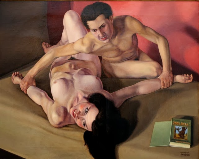 Una situación similar se aprecia en «Zoología» cuyo título está referido a ese libro que, nuevamente, ocupa la posición inferior derecha del cuadro. Posiblemente alude a una expresión sexual que no nos diferencia de los animales. Las expresiones, especialmente la de la mujer, parecen contradecir la aparente violencia sexual derivada de la posición de manos y brazos.