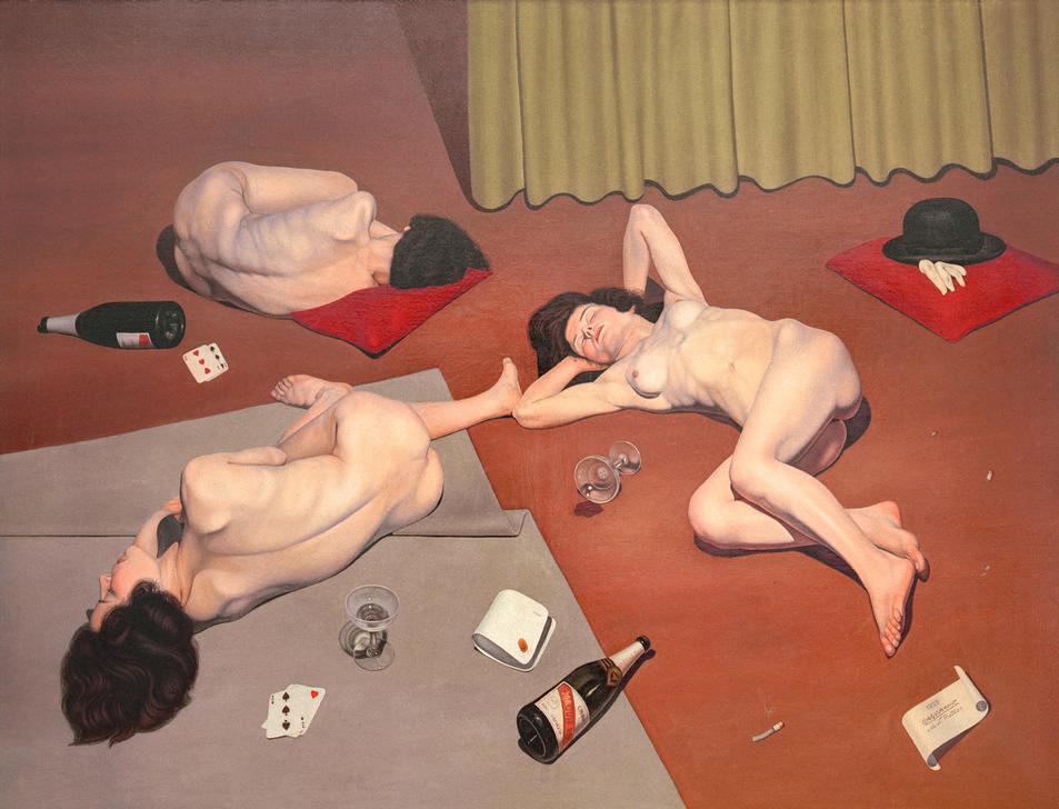 La obra más conocida del autor es «Después de la orgía». Parece que esta obra se encuentra, de algún modo, ligada a la que acabamos de ver. ¿Tres mujeres similares o una misma mujer que duerme o duermen en distintas posturas?. Lo que está claro es que no necesitamos el título para conocer la situación. Juego, alcohol y sexo (insinuado por ese sombrero y guantes) nos presentan unas figuras a través de una mirada más crítica que erótica. Una presentación hiperrrealista (antes de que existiese ese movimiento) con líneas de contorno duras y delimitantes, sin sombras. La presentación de los objetos en el suelo muestra una artificialidad buscada. No hay bebidas derramadas, no hay suciedad. El autor firma en un un papel semi-enrollado que ocupa la misma posición que el dinero en la pintura anterior.