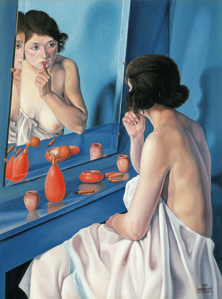 La crítica social parece suavizarse en «Mujer en el espejo». La mujer pinta ensimismada sus labios mientra dialoga con una imágen o imágenes que le devuelve el espejo como la expresión de la mirada del otro.
