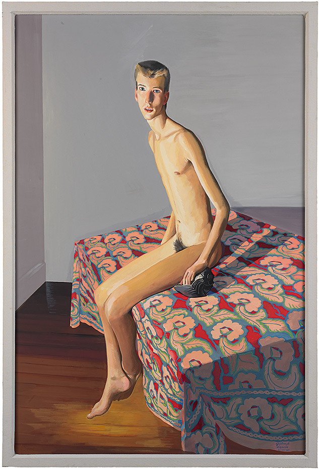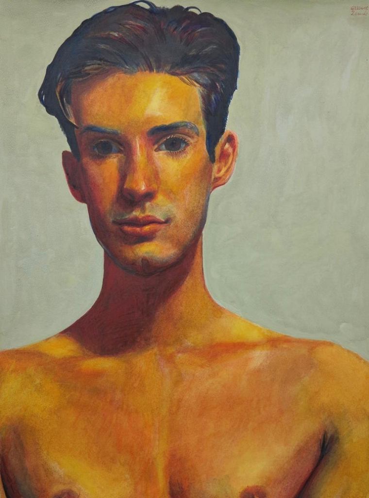 Recientemente, he mostrado en este blog una parte de la producción artística de Delmas Howe, que calificaba de «arte gay». Quiero hoy presentarles a un pintor con un estilo muy diferente. Gilbert Lewis (Hampton, Virginia, USA, 1945) es posiblemente artista homosexual, que retrata, fundamentalmente, a personajes homosexuales. Pero, ni siquiera una obra como «Tibuto», en la que se evidencia una historia de caracter sexual, me harían etiquetar como «gay» su pintura.
