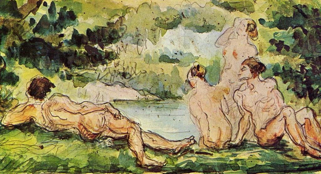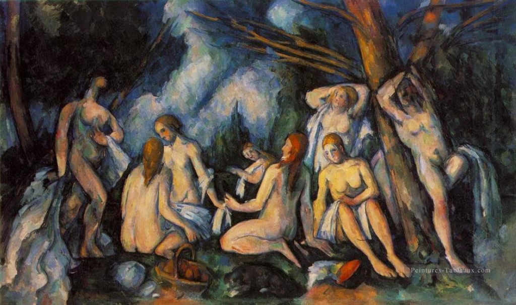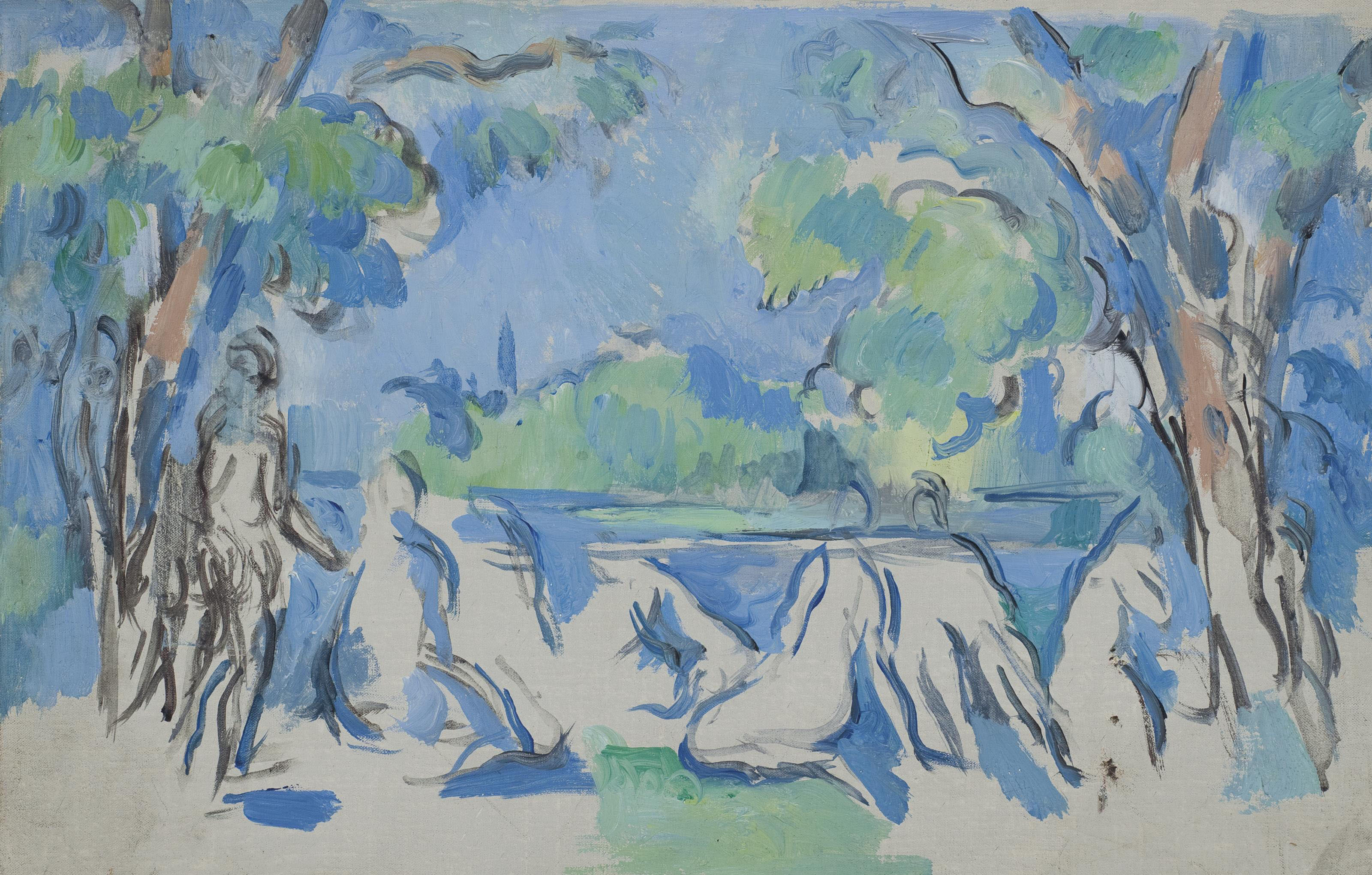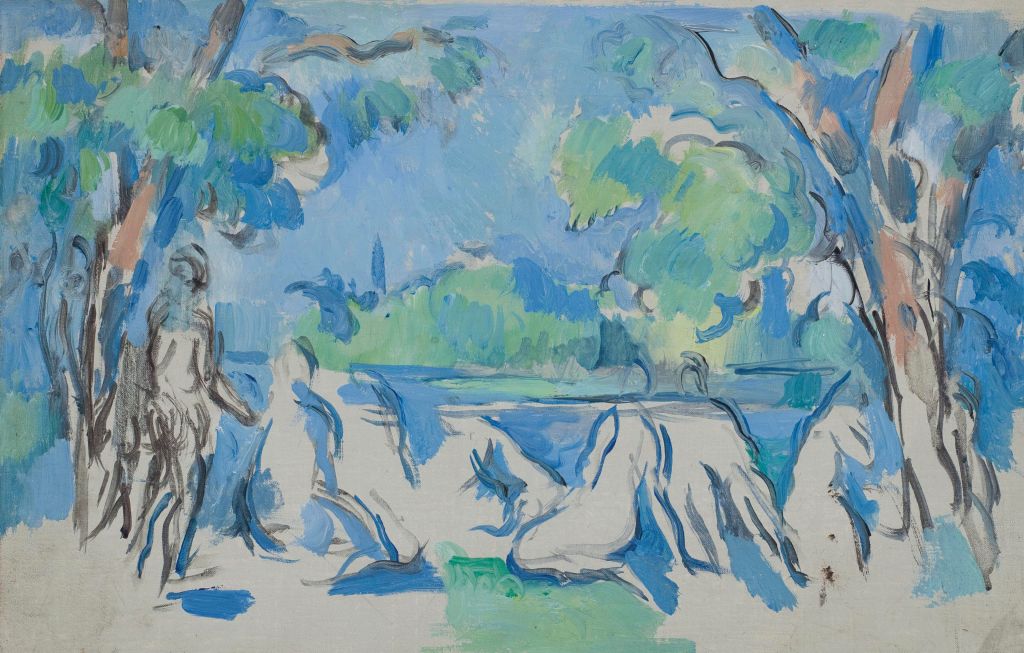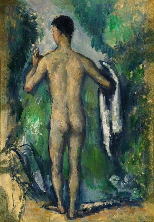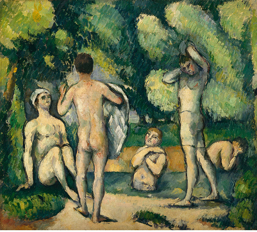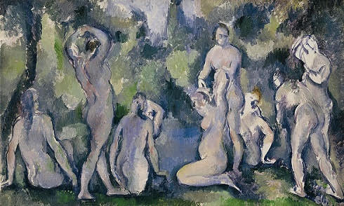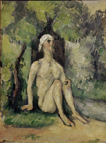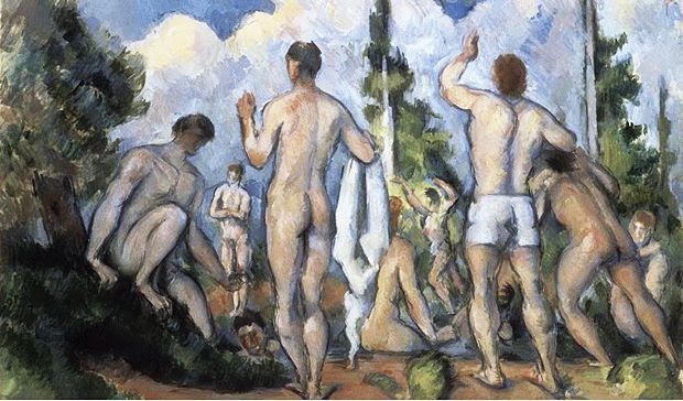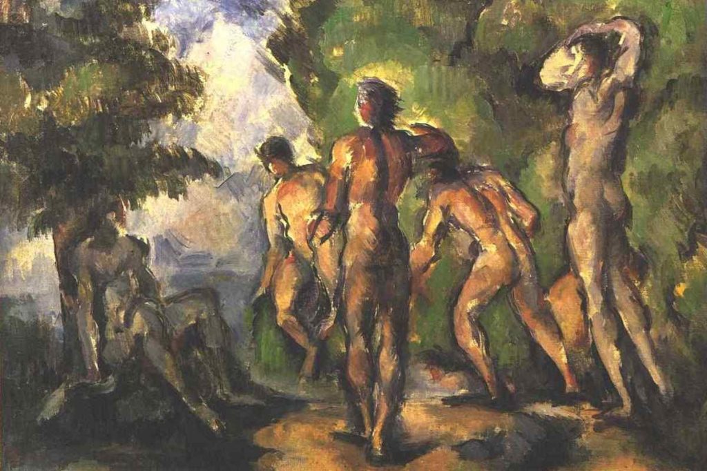 Enfrentarse a la obra de Paul Cézanne (Aix-en-Provence, Francia, 1839-1906) es difícil, incluso tratándose de la pequeña parte de su producción que corresponde al desnudo. Estamos ante uno de los artistas más influyentes del siglo XX, pese a que su éxito fue tardío y vivó relativamente aislado tanto de sus compañeros impresionistas como de la crítica y el público. El postimpresionismo de Cézanne lleva, casi a su extremo, las propuestas visuales del impresionismo y su deseo de mostrar la realidad tal y como la percibimos, sin intentar modificarla mediante consideraciones basadas en una hipotética naturaleza objetiva de la misma. De este modo intentó reflejar en algunas de sus obras la visión estereoscópica de los objetos, es decir, la sutil diferencia de visión de los dos ojos, que el cerebro fusiona y reinterpreta. Las formas se simplifican y adquieren una cierta geometrización que preludiará tanto el cubismo como la abstracción. El color adquiere una dimensión estructural. Posiblemente, los elementos más característicos de la pintura de Cézanne se desarrollen en sus paisajes y bodegones. Trató la figura humana sólo durante un pequeño periodo de tiempo y nunca se sintió satisfecho por el resultado. Dentro de estos trabajos les mostraré, en esta primera reseña, las referidas a «los bañistas» (casi siempre mujeres) al mostrar una gran coherencia estilística y temática.