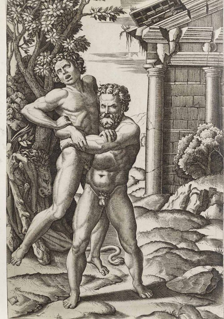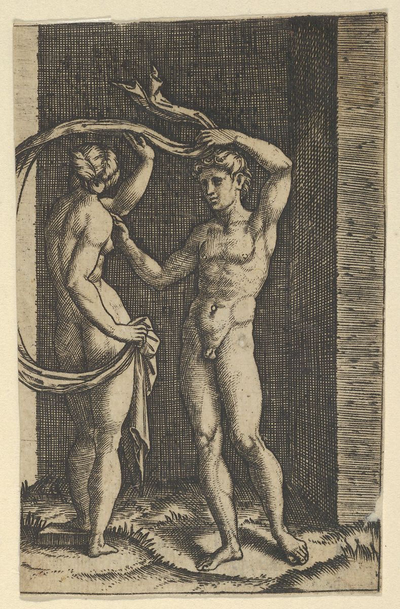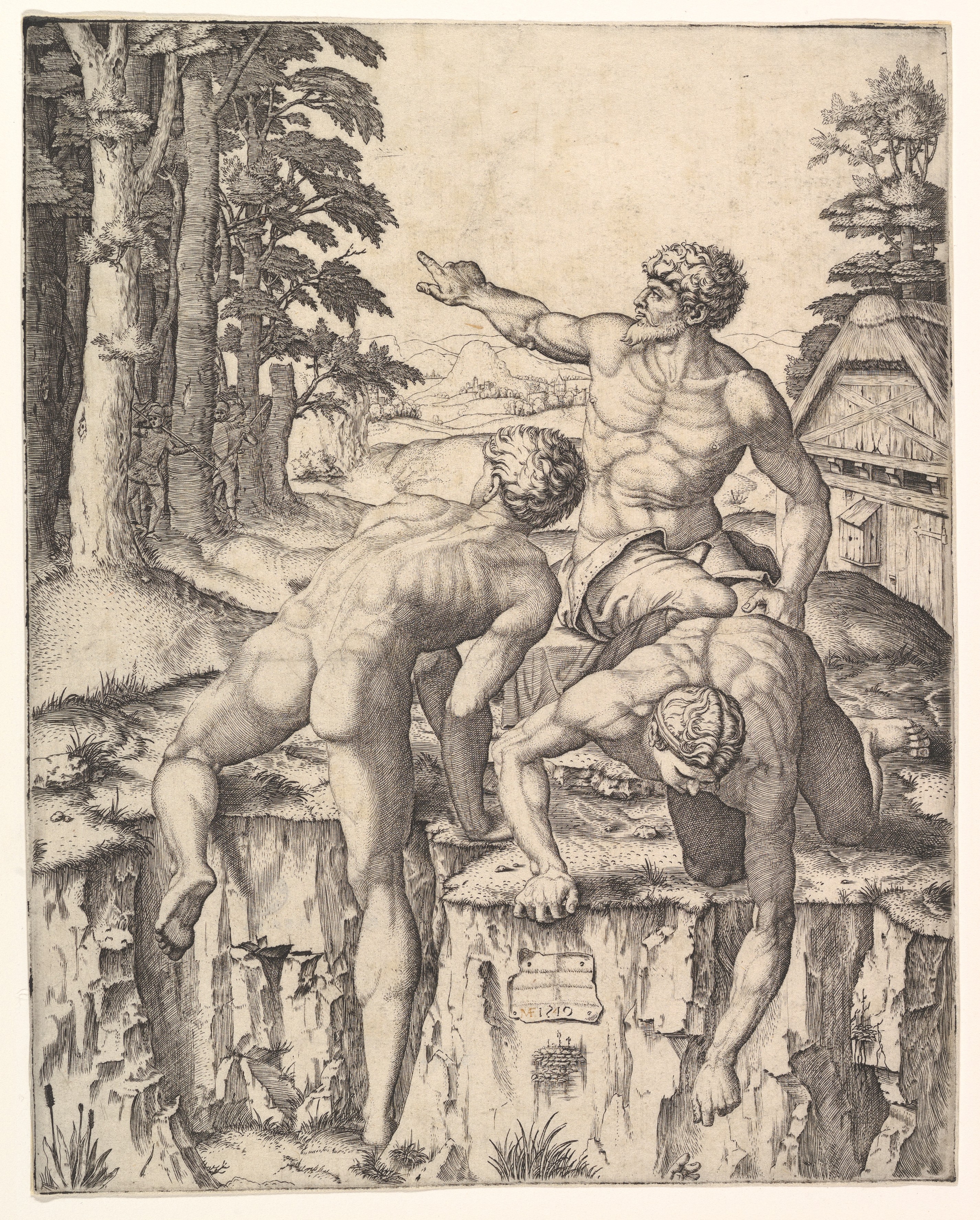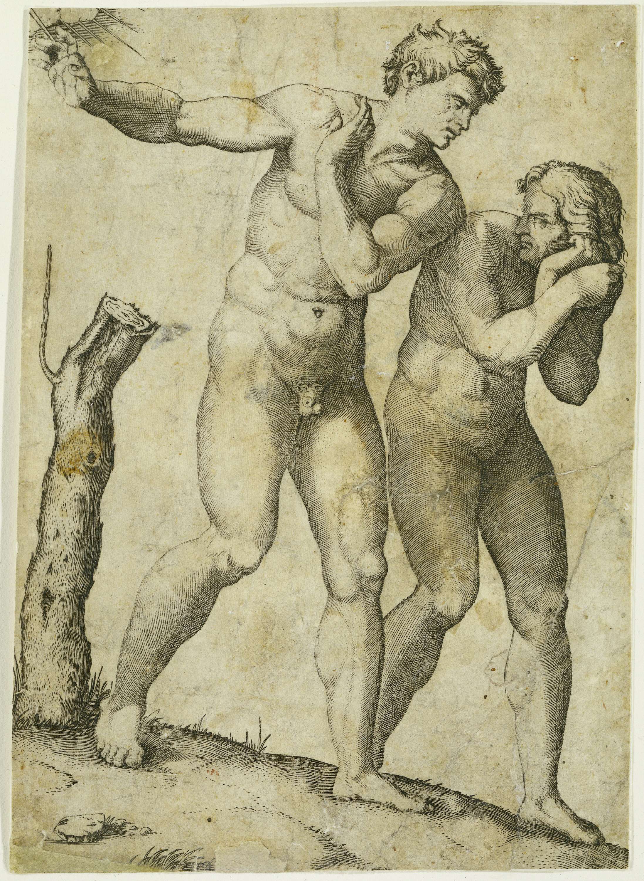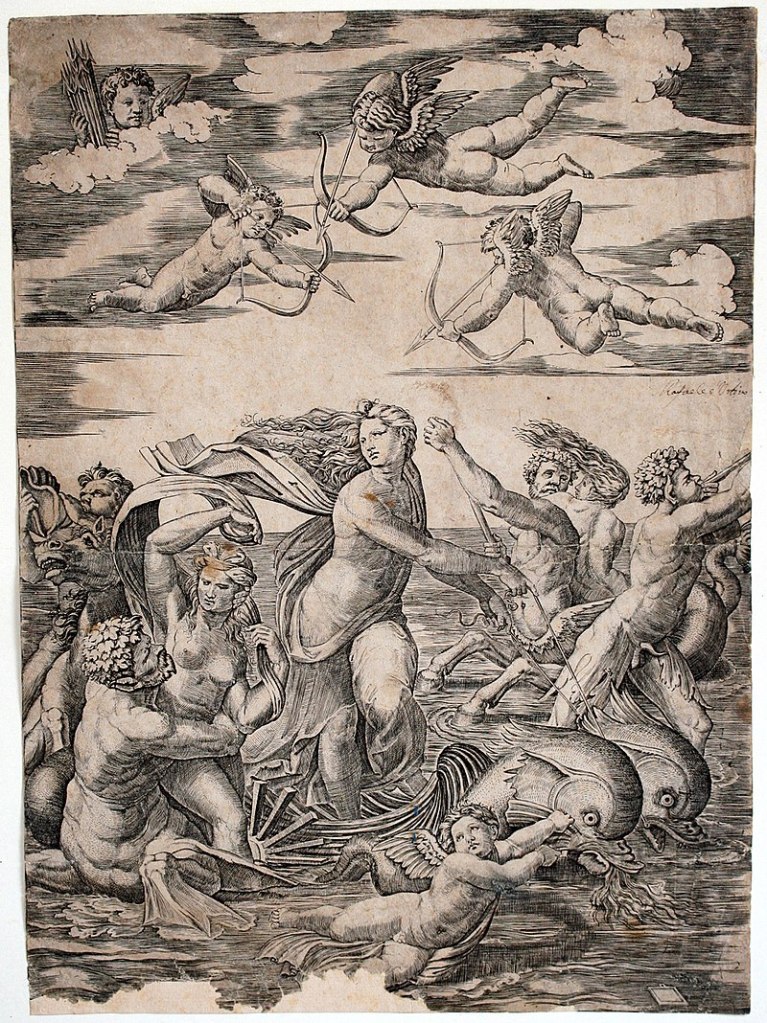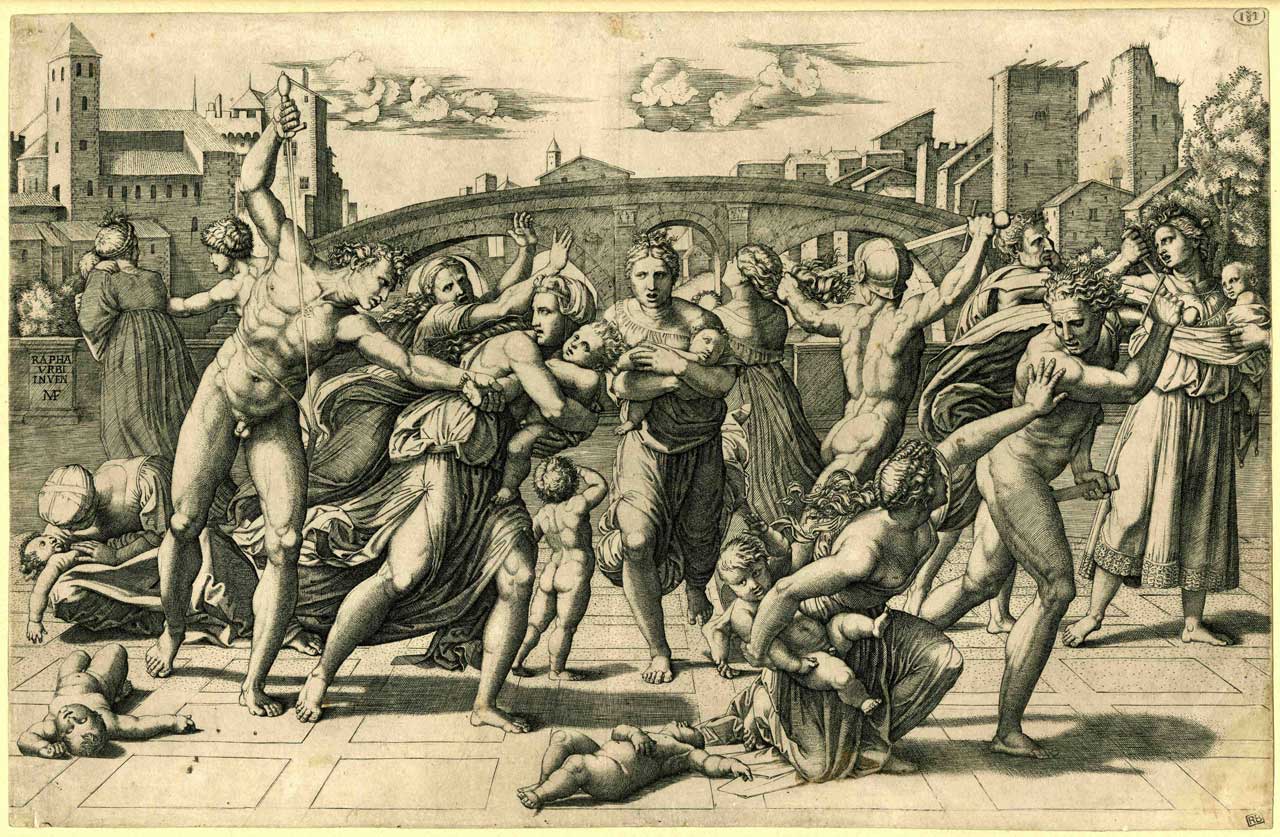 La obra de Marcantonio Raimondi, o Marcantonio (Molinella, Italia, 1480-1534) tiene un gran interés historiográfico no sólo por la cuidada ejecución de su obra sino porque fue el primer impresor de grabados en serie, contribuyendo de este modo a la difusión de las obras artísticas por toda Europa. Se dedicó especialmente a la obra de Rafael, de la que llegó a reproducir no solo sus pinturas concluídas sino sus bosquejos y dibujos. También reprodujo muchas obras de Durero. Se comenta que éste tuvo que acudir a la justicia veneciana para impedir que en las copias de Marcantonio se reprodujese también su logotipo (esa célebre A), con la consiguiente incertidumbre de la autoría. No resulta muy claro qué diseños son propios y cuáles ajenos y tampoco los que pudieron ser ejecutados por su taller. La grabación de los «I Modi», obra erótica de Giulio Romani le dió notoriedad y lo condujo a la cárcel. No voy a mostrar éstos, comentados previamente, y me centraré en una selección de su vasta obra.