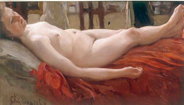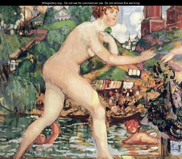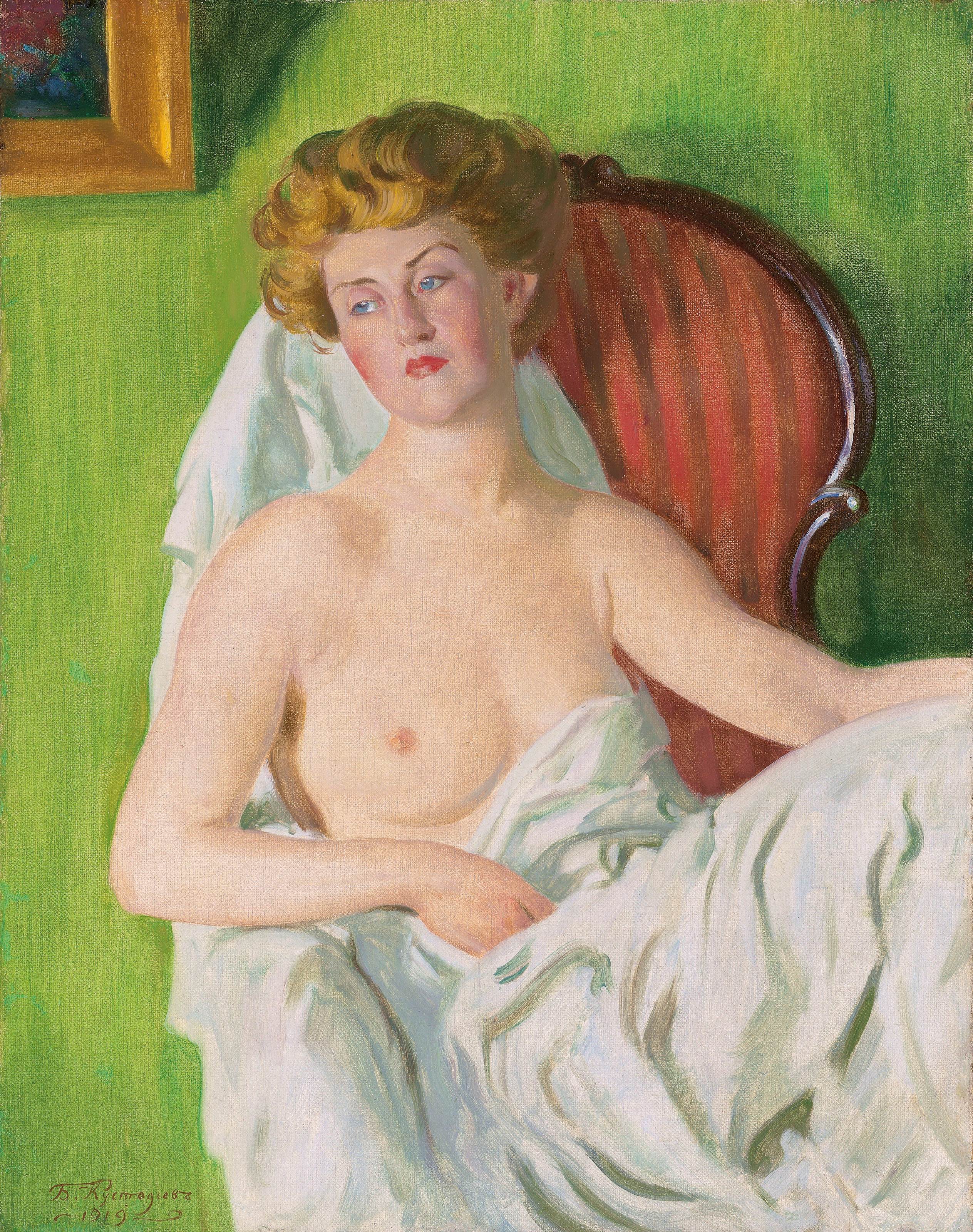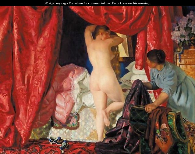Borís Mijáilovich Kustódiev (Astracán, Rusia, 1878-1927) fue un pintor, grabador, ilustrador y escenógrafo ruso, creador de unas pinturas en las que se destaca una pintura de género fuertemente colorista. Si no eres un gran conocedor de su obra, su imagen te vendrá asociada a su célebre «El Bolchevique» en el que un gigante, representante del proletariado, es portador de una bandera roja que, como él mismo, se sale del marco. Se discute el verdadero significado de esta obra, apropiado por ambos bandos de la Revolución Rusa. Sus desnudos, sin embargo, no tienen ninguna connotación política. Abundan, casi de un modo repetitivo, mujeres rubias que nos recuerdan a Rubens, ambientes íntimos y alguna imagen erótica.