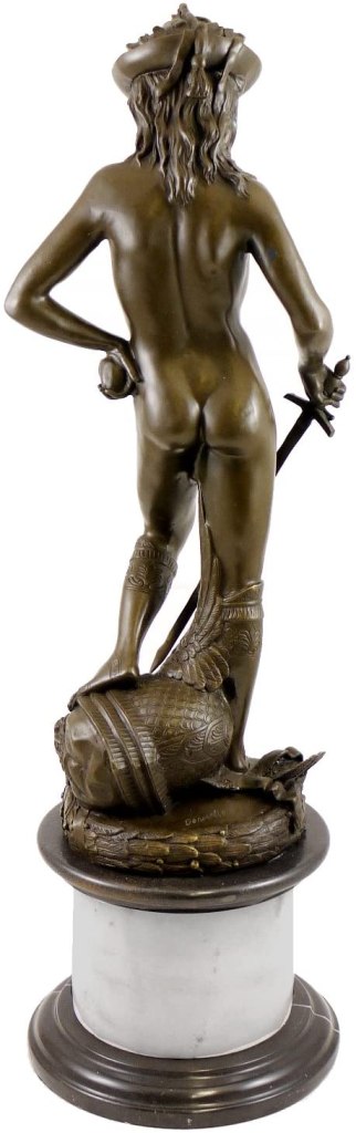 Donato di Niccolò di Betto Bardi, conocido como Donatello (Florencia, Italia, 1386-1466) es uno de los artistas más destacados del Quattrocento italiano. Sus grandes aportaciones a la escultura se relacionan con la escultura en bronce y con una particular técnica de bajorrelieve, conocida como «stiacciato» (relieve aplanado), capaz de generar una gran sensación de relieve con una profundidad real muy pequeña. Sin duda, su nombre se encuentra asociado a su interpretación del David bíblico, el primer desnudo renacentista en bronce. Realizada alrededor de 1440 se anticipa unos veinte años a la versión de Verrochio y, netamente, a la de Miguel Ángel, que es del siglo siguiente. Nos muestra a un joven, casi un niño, con cabello largo y tocado con un sombrero florentino, armado con la espada de Goliat cuya cabeza yace a sus pies. La pierna izquierda, ligeramente flexionada, desplaza la cadera derecha y el equilibrio del cuerpo se logra gracias a la compensación del brazo con la mano apoyada en la cadera (que esconde la piedra de la onda). Ese aspecto cimbreante, que había utilizado ya Praxíteles, le da una gran ligereza a la obra y un ligero carácter femenino a la figura.