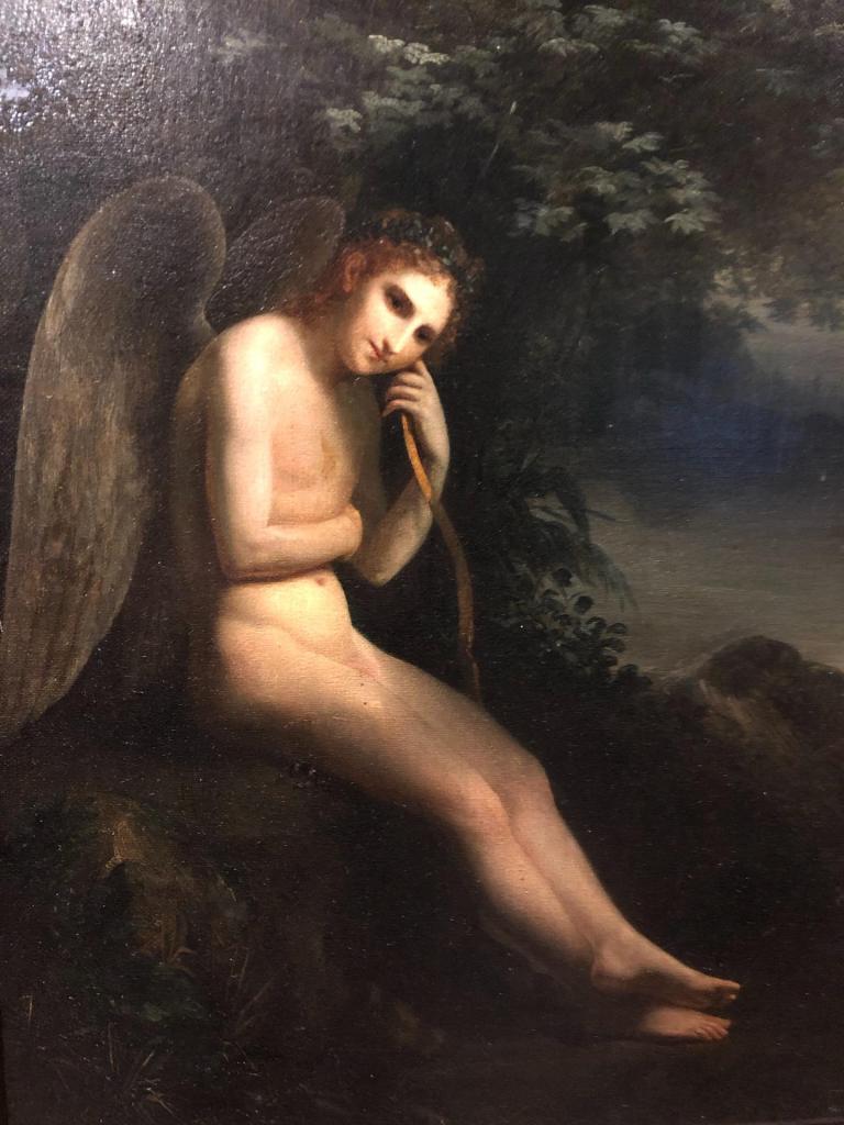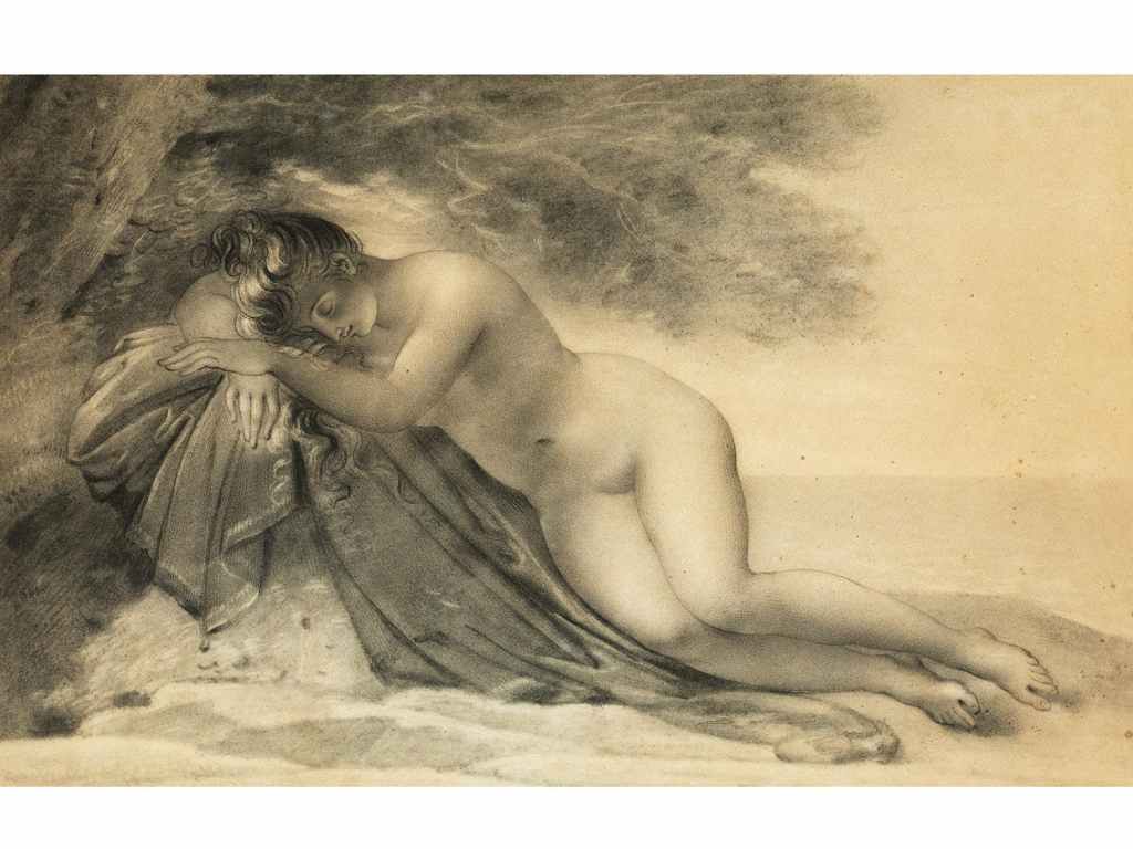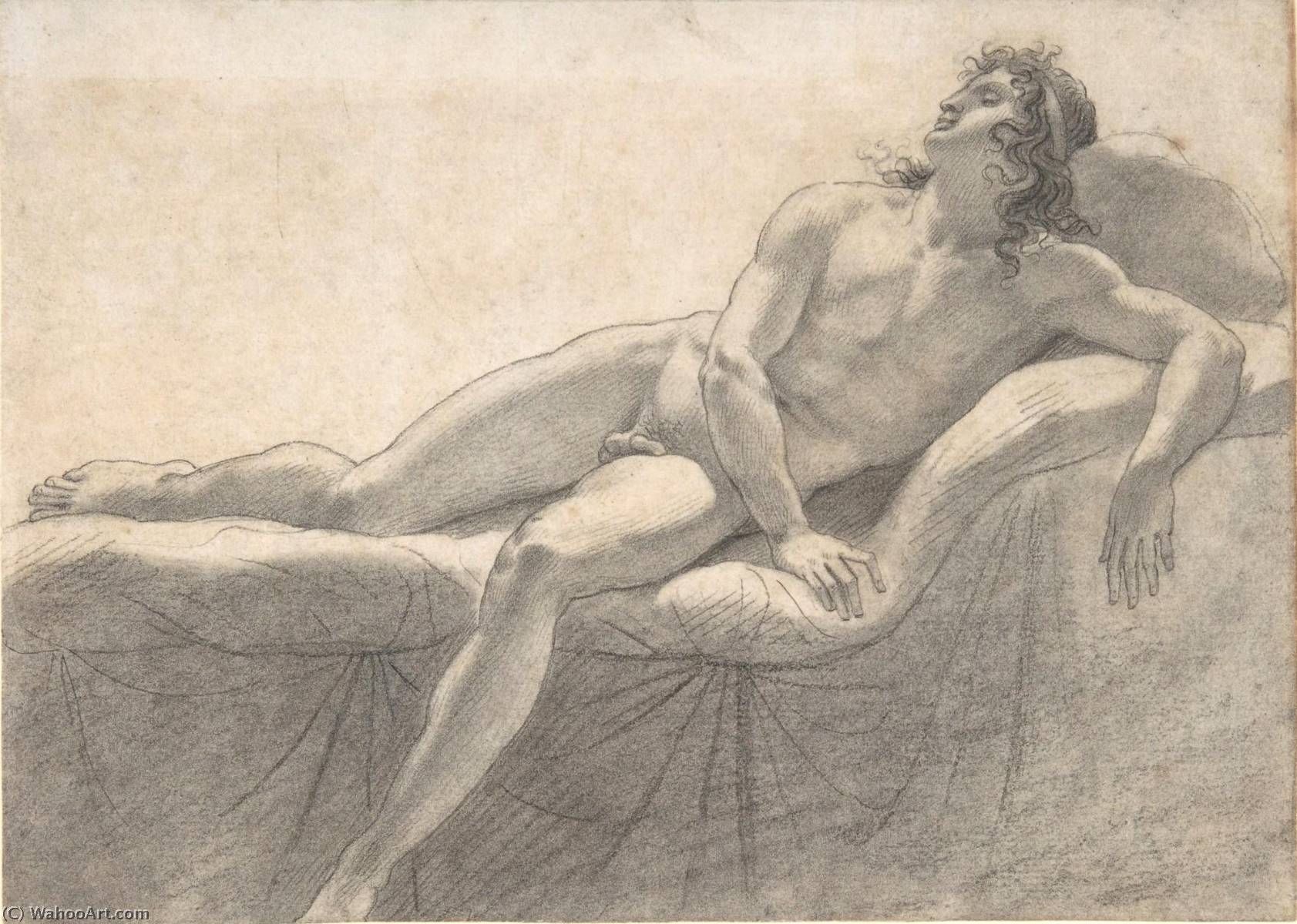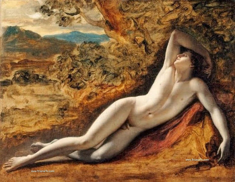Anne-Louis Girodet (Montargis, Francia, 1767-1824) fue uno de los principales discípulos de David y uno de los destacados artistas que protagonizaron la transición entre el neoclasicismo y el romanticismo. Los aspectos formales del neoclasicismo de su maestro son evidentes, pero se empieza a incorporar a los mismos dos aspectos muy románticos: los contrastes lumínicos y un cierto erotismo. Este último -especialmente de carácter homoerótico – no está ausente de la pintura neoclásica, pero en ella adquiere siempre un tono muy contenido, casi frío. La obra más conocida de Girodet, «El sueño de Endimión», produjo un cierto revuelo. La figura masculina, adormilada, se nos presenta con un tipo de frontalidad que típicamente se aplicaba al cuerpo de la mujer, y los rayos de sol, muy activos, parecen destacar la pasividad de la figura. La composición triangular da un cierto protagonismo al sexo pese a que su tamaño, acorde con los criterios estéticos clásicos, no se encuentra maximizado. Sin embargo, las críticas a la obra parece que se centraron, en su momento, más en el uso de las luces que en el posible erotismo de la pintura.