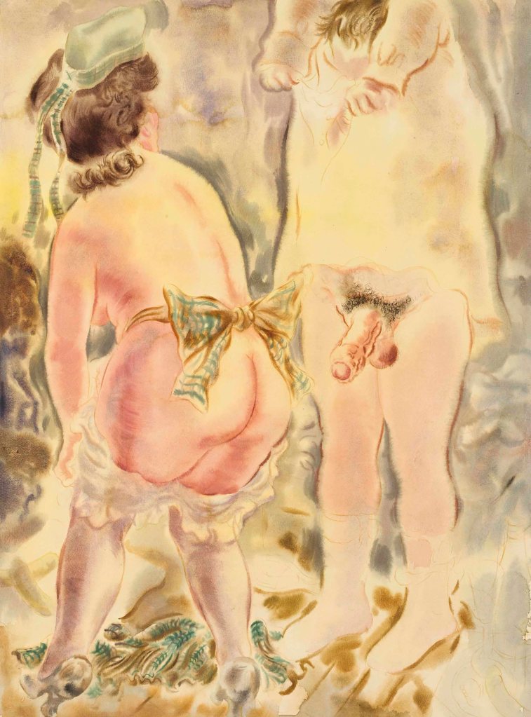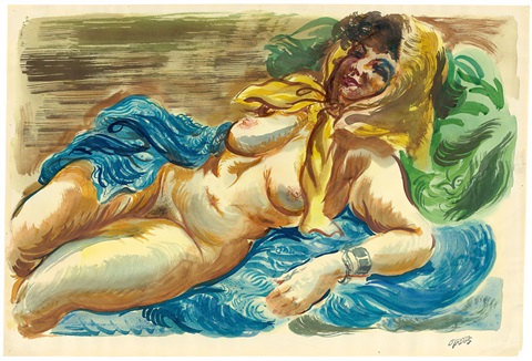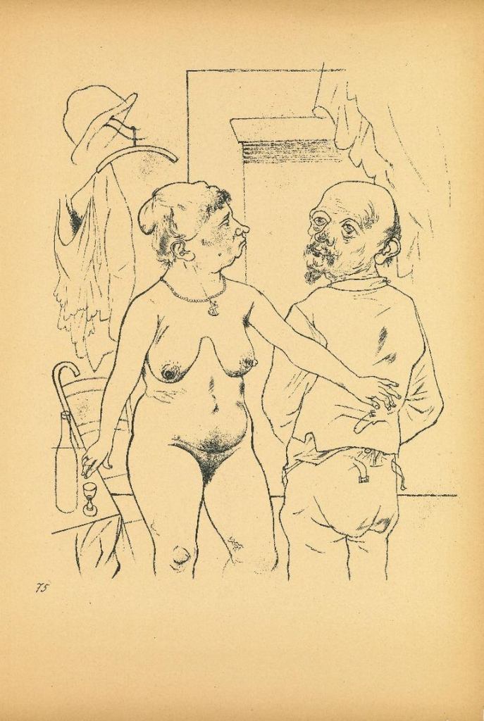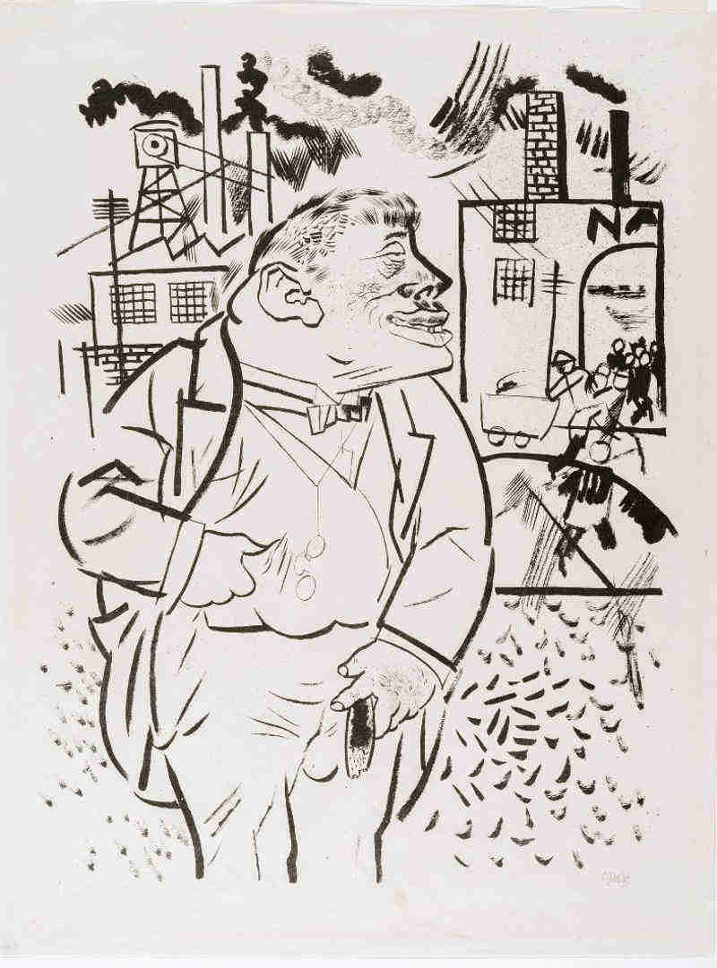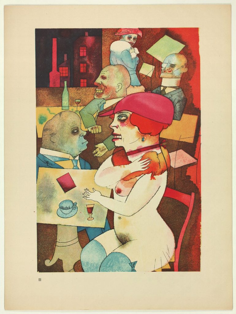 George Grosz (Berlín, Alemania, 1893-1959) fue uno de los máximos exponentes de la denominada «nueva objetividad» cuyo representante más conocido fue Otto Dix. A menudo se dice que este movimiento se enfrenta al expresionismo, y ello puede sorprendernos al analizar muchas de sus obras. Pienso en que existe un cierto grado de continuidad, aunque los nuevos artistas hacen mayor hincapié en el carácter figurativo de sus imágenes y, fundamentalmente, en la crítica social y política. Ese mayor figurativismo no implica ni mucho menos una copia «realista» del mundo circundante, y con frecuencia la obra adopta formas próximas a la caricatura e incluso grotescas. La Alemania de la República de Weimar se verá magníficamente retratada con estos artistas. Con la llegada al poder de Hitler, Grosz huyó a los Estados Unidos y adquirió la nacionalidad americana, aunque volvió a su país antes de morir.