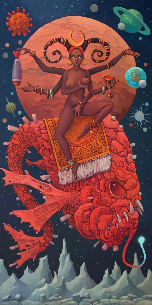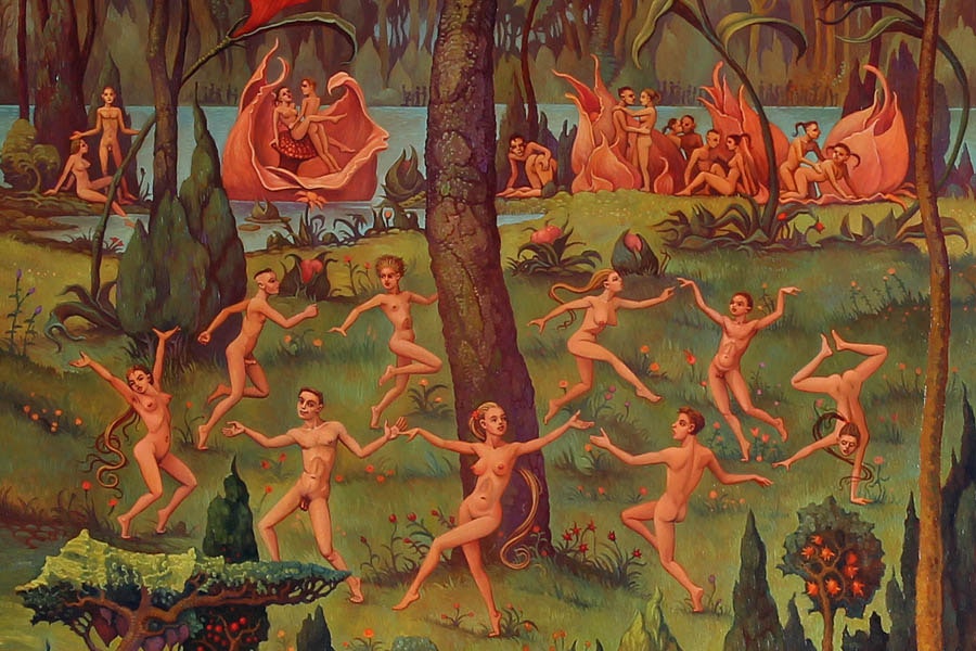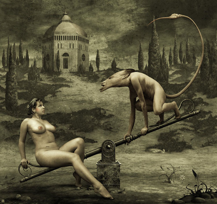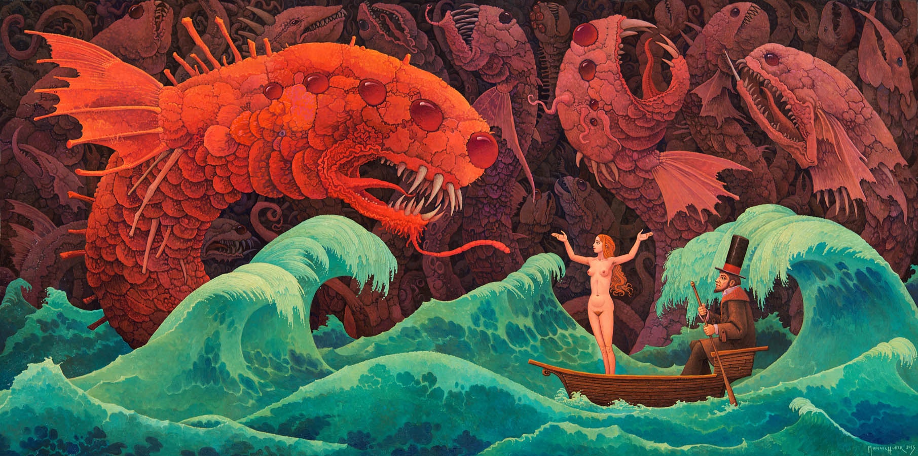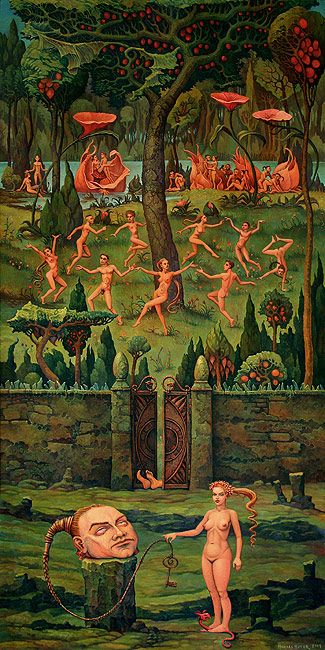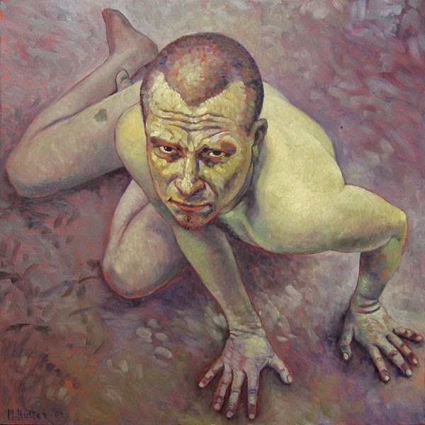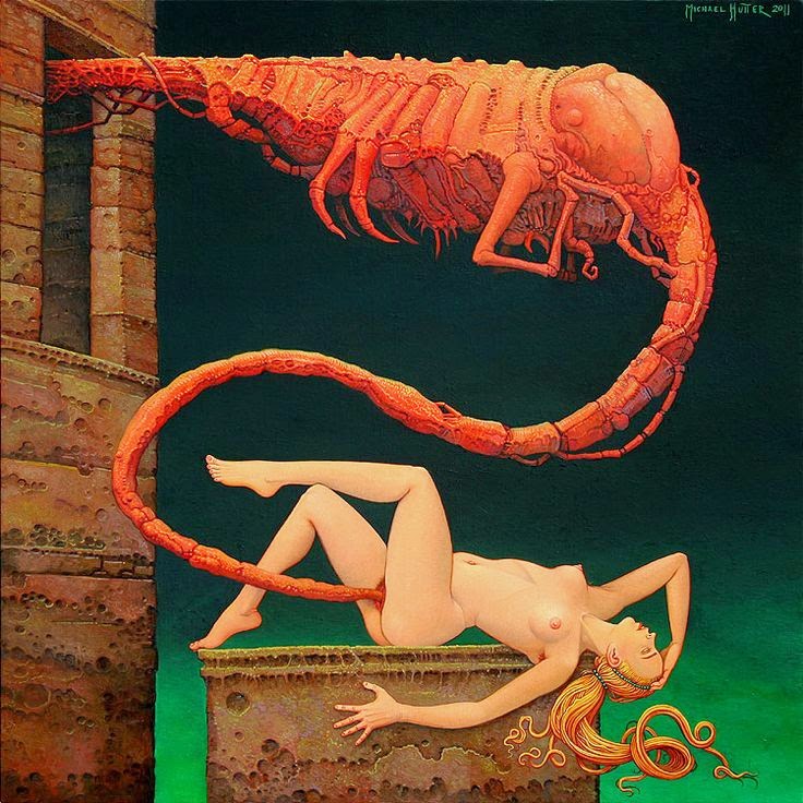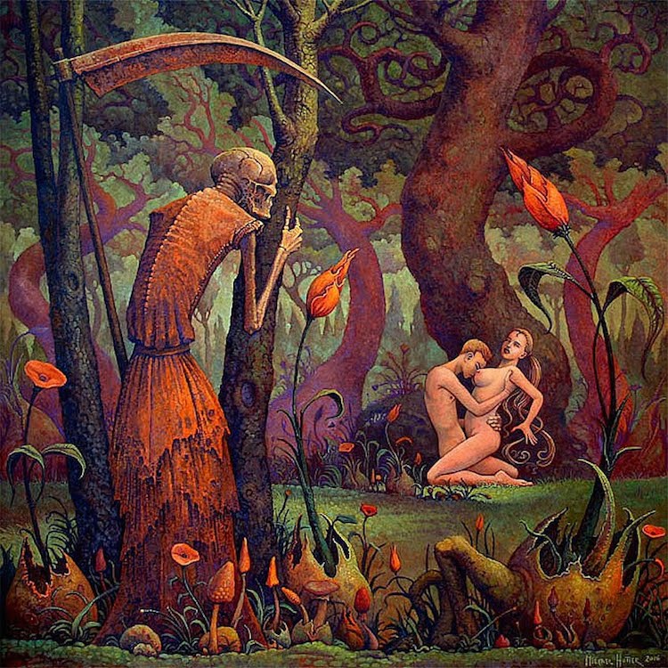 Más erotismo que muerte en este moderno surrealista. Michael Hutter (Dormagen, Alemania, 1963)- pintor, artista gráfico y escritor – recrea el mundo onírico del Bosco con un cromatismo intenso y contrastado, pero al mismo tiempo el universo erótico del surrealismo y dadá. Sus óleos, grabados y obras digitales han sido motivo de exposiciones individuales en Alemania, Bélgica y Austria y, asimismo, han servido para ilustrar obras de fantasía y álbumes musicales.