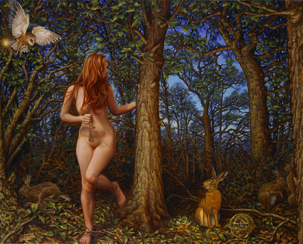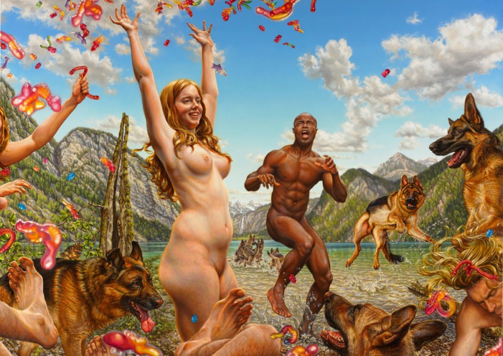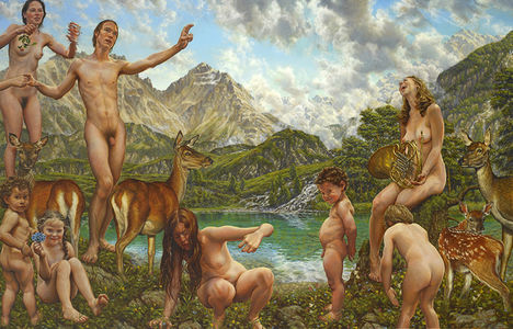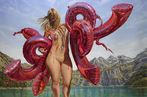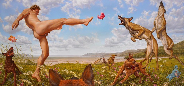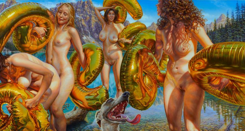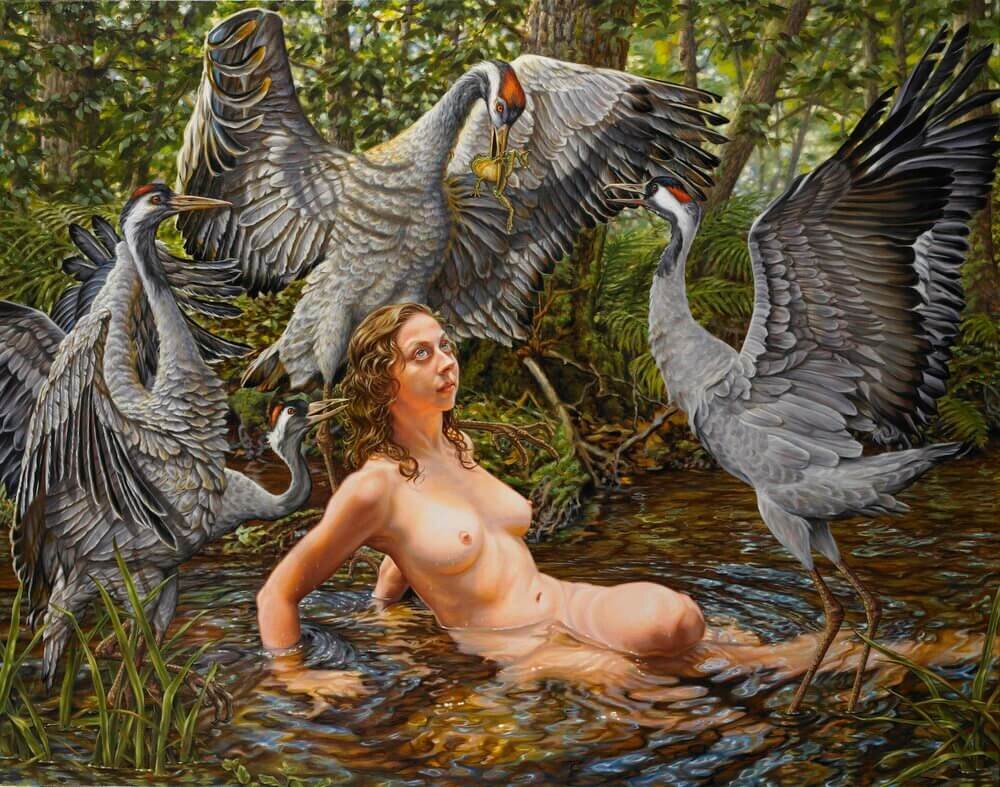 Susannah Martin (Nueva York, USA,1964) no tiene nada que ver con la diseñadora e ilustradora española Sussana Martín ni, por supuesto, con aquella mujer ejecutada por brujería en Salem en el siglo XVII. Se trata de una muralista que desarrolla su actividad en Frankfurt, Alemania, desde los años noventa del pasado siglo. Su obra muestra un dibujo muy definido, al estilo de los hiperrealistas, con fuertes contrastes cromáticos y figuras casi siempre en movimiento que nos muestran el instante, como un fotograma congelado. Sus desnudos se plantean inmersos en una naturaleza en la que abundan los animales, pero también formas extrañas, de apariencia plástica. Hay algo surrealista e inquietante en la obra de esta artista, de la que les muestro algunos ejemplos.