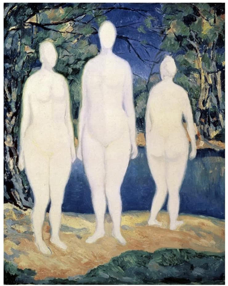 No es que disponga de demasiadas imágenes de desnudo que mostrarles realizadas por Kazimit Malévich (Kiev, Rusia, actualmente Ucrania, 1878-1935), pero pienso que resulta difícil imaginar que uno de los iconos del arte abstracto, el verdadero creador del suprematismo ruso y al que debemos composiciones tan maravillosas como sus «ocho rectángulos» (por la que siento una gran admiración, casi debilidad) haya tenido una etapa realista y haya vuelto sobre la misma al final de sus días. Malévich, de hecho, se inició en el postimpresionismo y tuvo una etapa cubista y, posteriormente futurista, antes de su producción suprematista. De su inspiración cezanniana podemos destacar estas dos magníficas obras que llevan por título «bañistas»: