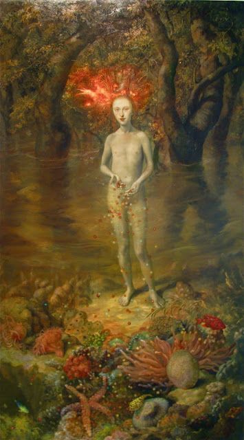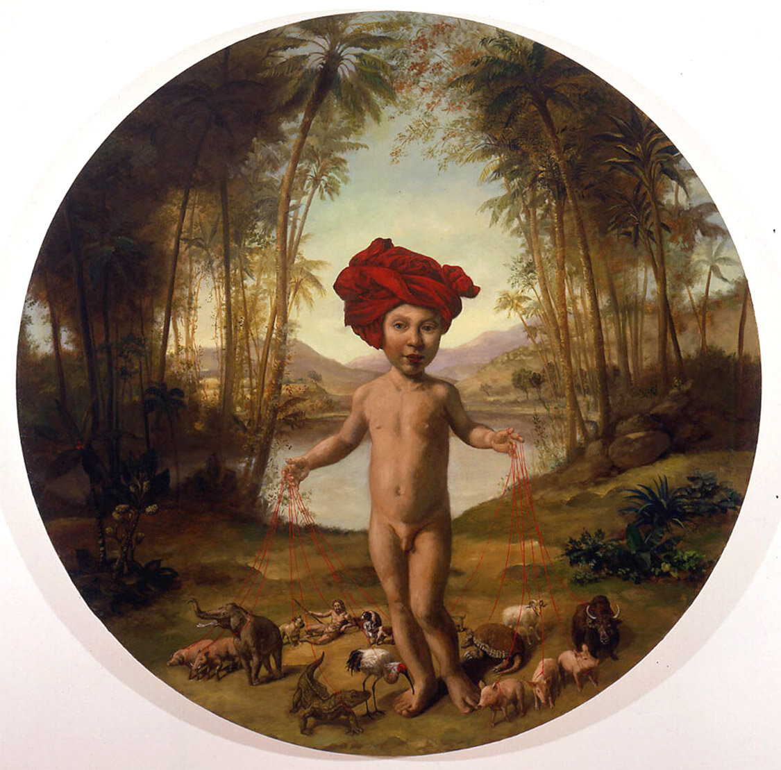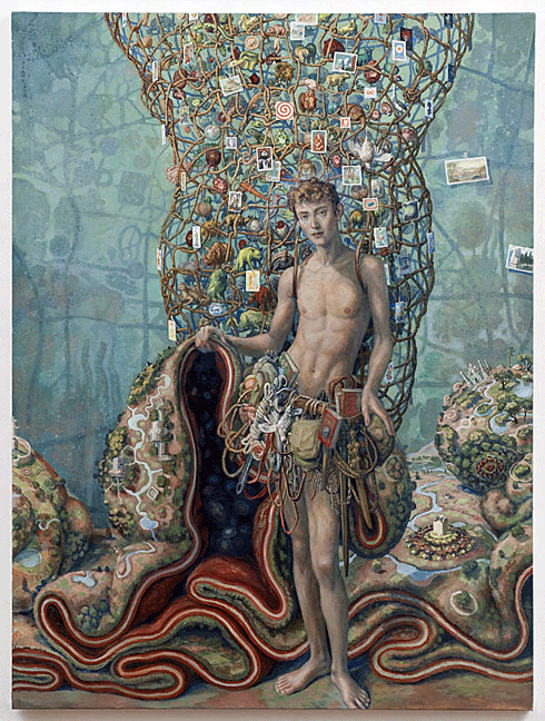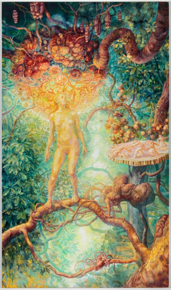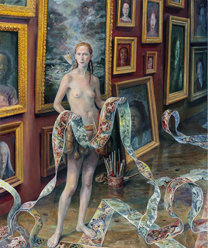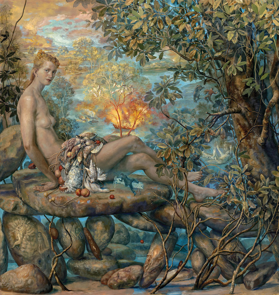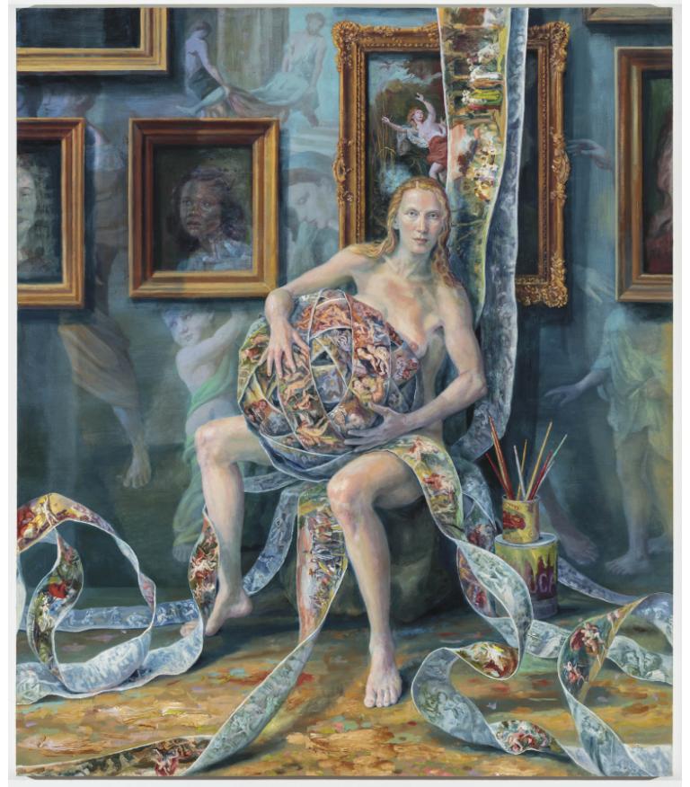 El barroco y rococó más absoluto en un mundo surrealista del siglo XXI es una de las claves identitarias de la artista Julie Heffernan (Peoria, Illinois, USA, 1956) cuya obra, siempre etiquetada como «autorretrato con…», es afín al realismo mágico. Utiliza la vieja técnica del óleo sobre lienzo y nos narra una historia oscura, aparentemente con un transfondo ecologista, que se encuentra llena de referencias a la historia del arte.