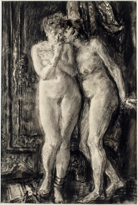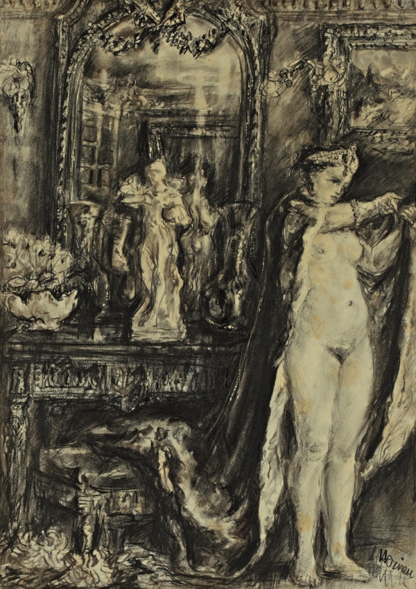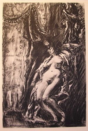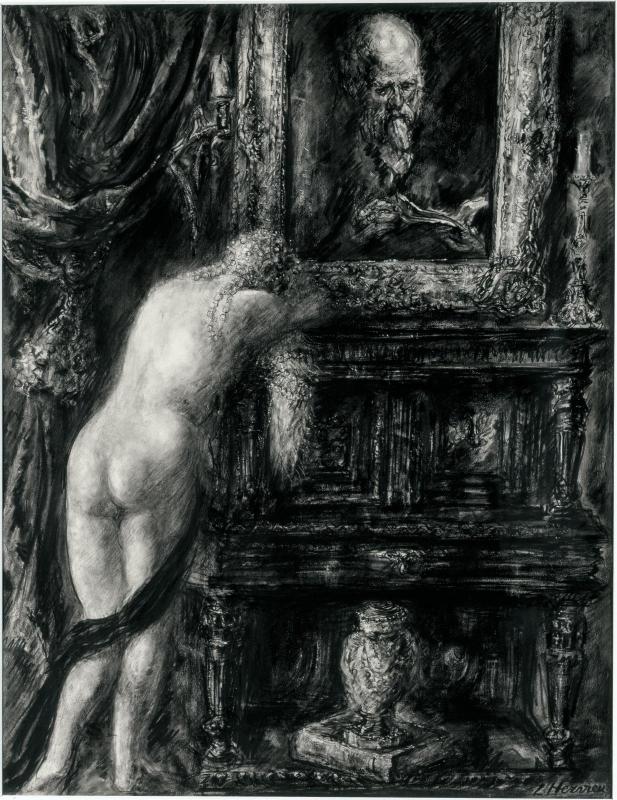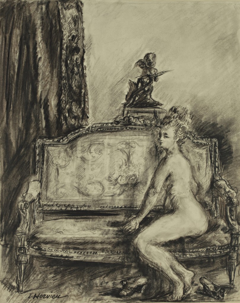 La obra de Louise Hervieu (Alenzón, Francia, 1878-1954) se vio tremendamente condicionada por el estado de salud de la artista. Hervieu nació sifilítica y su visión se fue deteriorando rapidamente, de modo que abandonó pronto la pintura para pasar al dibujo, y el color, para pasar al blanco y negro. En sus dibujos, realizados con lápiz y carboncillo, nos muestra a la mujer situada en unos interiores barrocos, Luis XV. Una buena parte de ellos sirvieron para ilustrar la obra de Baudelaire.