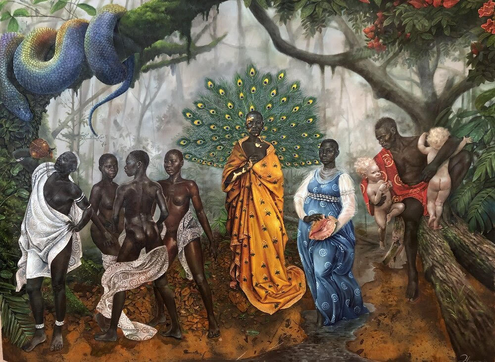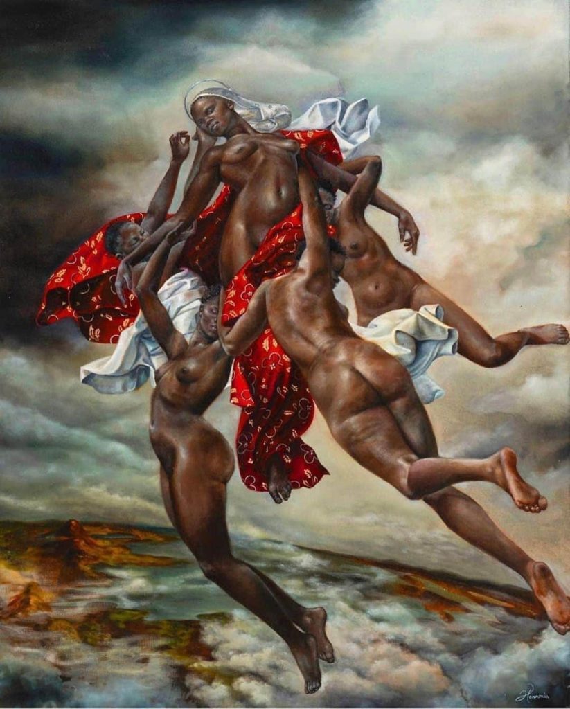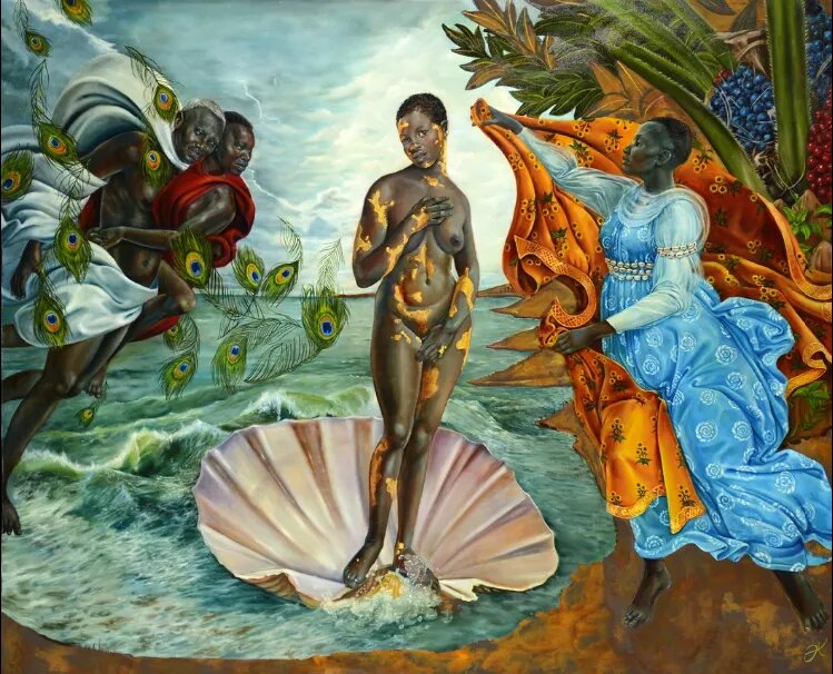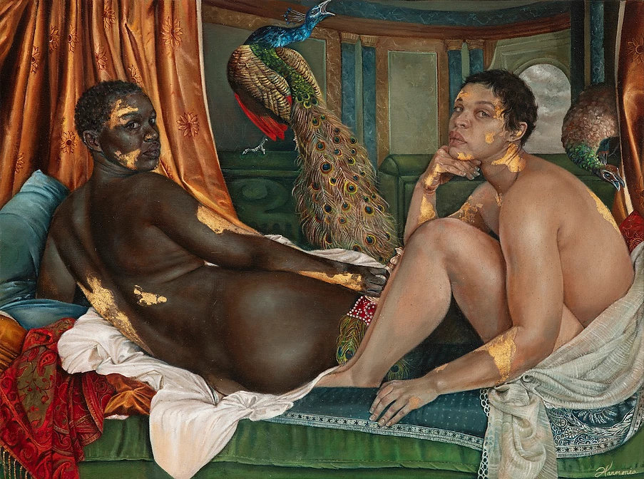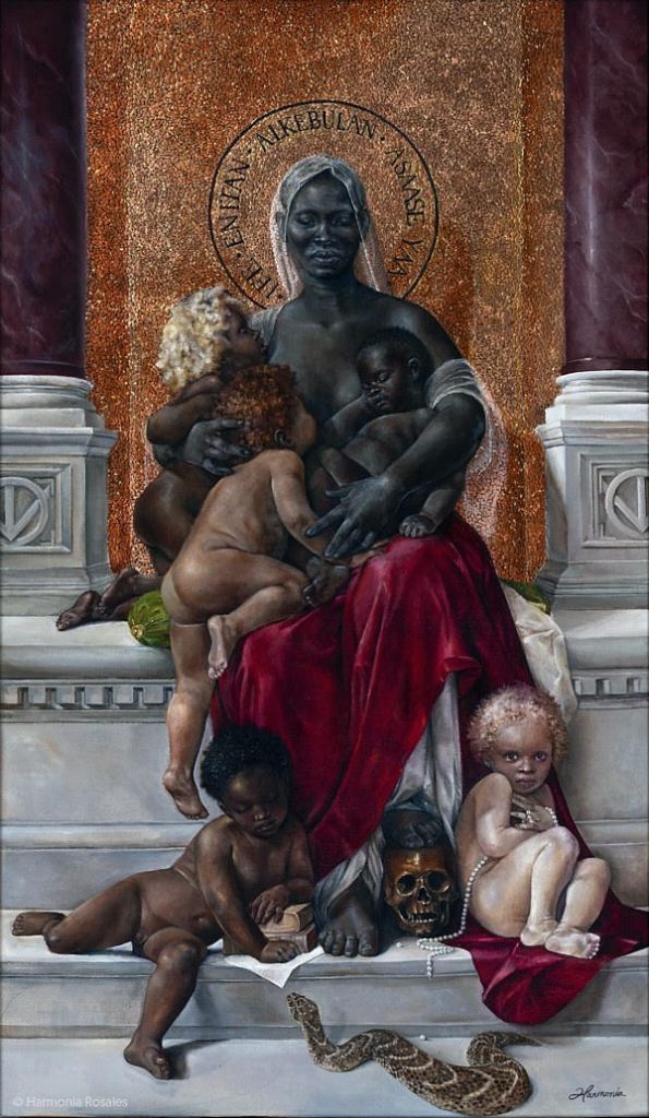 Artista, gran admiradora del Renacimiento italiano, Harmonia Rosales (Chicago, USA, 1984) nos muestra en su obra un discurso feminista que cuestiona la tradicional mirada masculina sobre el arte o la religión, sobre el varón (no el Hombre, sujeto genérico) como medida de todas las cosas, sobre la prepotencia de la raza blanca… Frecuentemente reinterpreta obras clásicas, que se encuentran en el imaginario colectivo, para trasponer sexos o razas. Una obra vibrante y colorista que nos invita a la reflexión.
