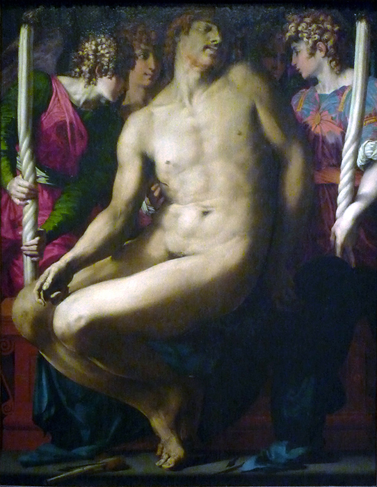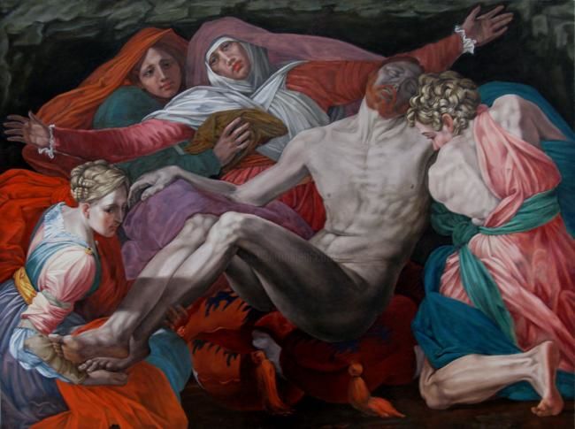 Rosso Fiorentino (rojo florentino) es el nombre por el que suele conocerse al artista Giovanni Battista di Jacopo (Florencia, Italia, 1494-1540) por el color de su pelo. Su obra, de inspiración dramática, es una clara muestra del estilo manierista y está fuertemente inspirada en la de Miguel Angel. Los «contrapostos» de las dos figuras de Cristo, estructuralmente muy parecidos y con los que inicio esta presentación, son una buena muestra de ello: