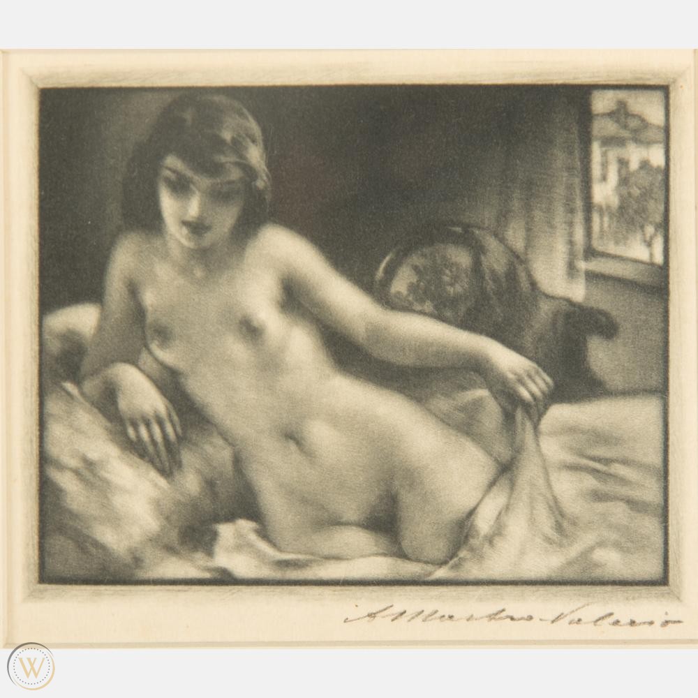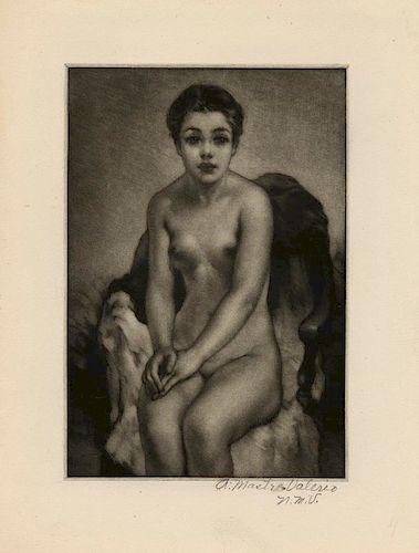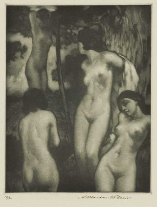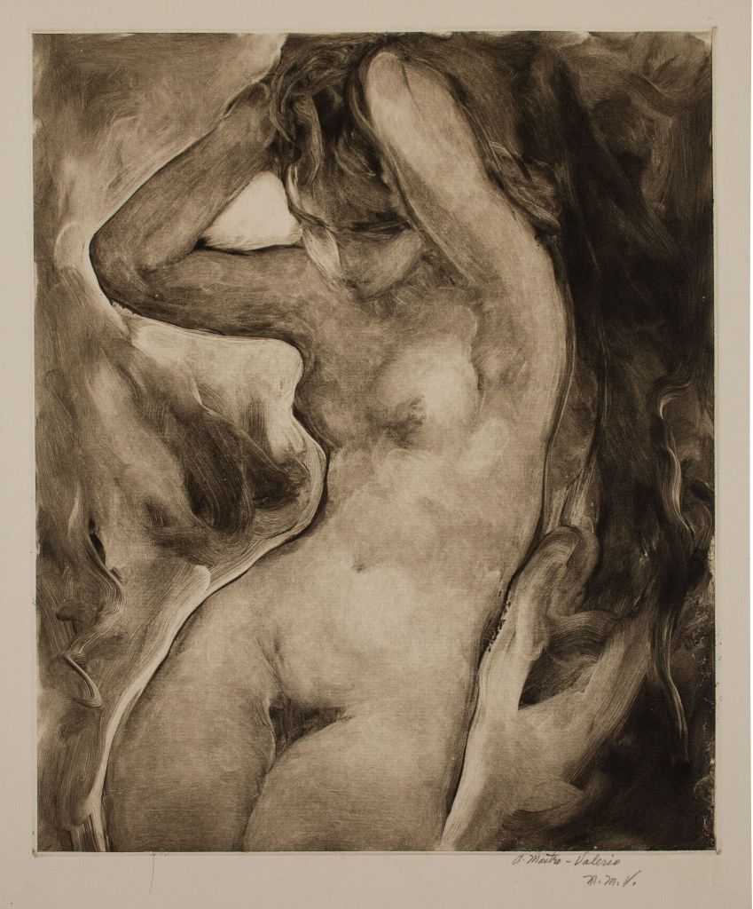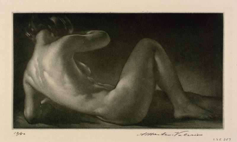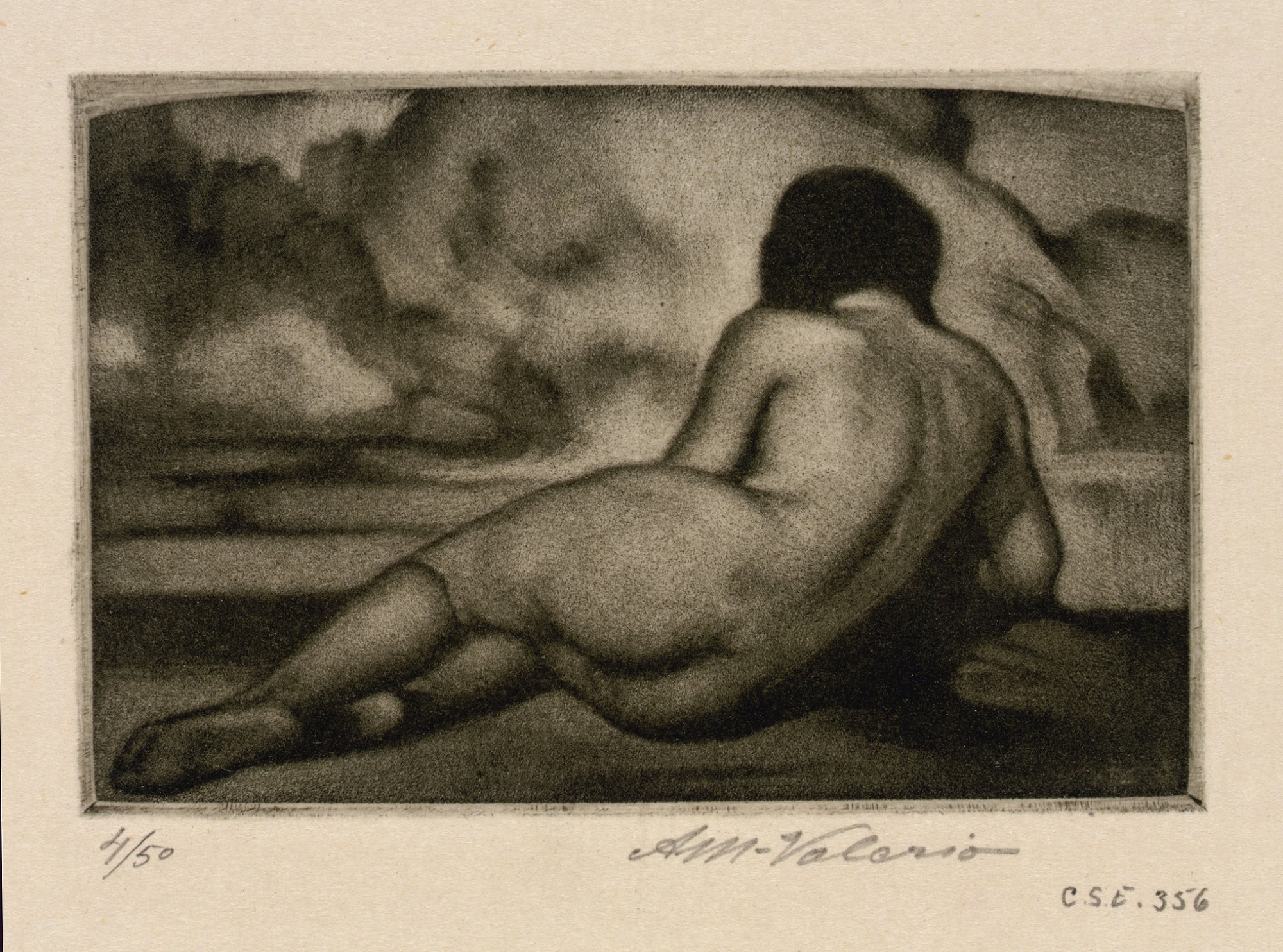 Sin lugar a dudas, las obras más conocidas del artista italo-americano Alessandro Mastro Valerio (Sannicandro Garganico, Italia, 1887-1953) son sus grabados a la media-tinta – también conocidos como a la manera negra o al humo – de mujeres desnudas. Esta compleja técnica le permitió generar una amplia gama de tonos de grises que confieren a sus figuras tanto volumen como un aspecto aterciopelado. Mastro-Valerio emigró en 1913 a los Estados Unidos, donde ejerció como docente en la Universidad de Michigan y llevó a cabo una actividad artística que comprendía técnicas tan diversas como el grabado, el óleo o la acuarela, una gran variedad temática, y un estilo que fue evolucionando hacia la abstracción.