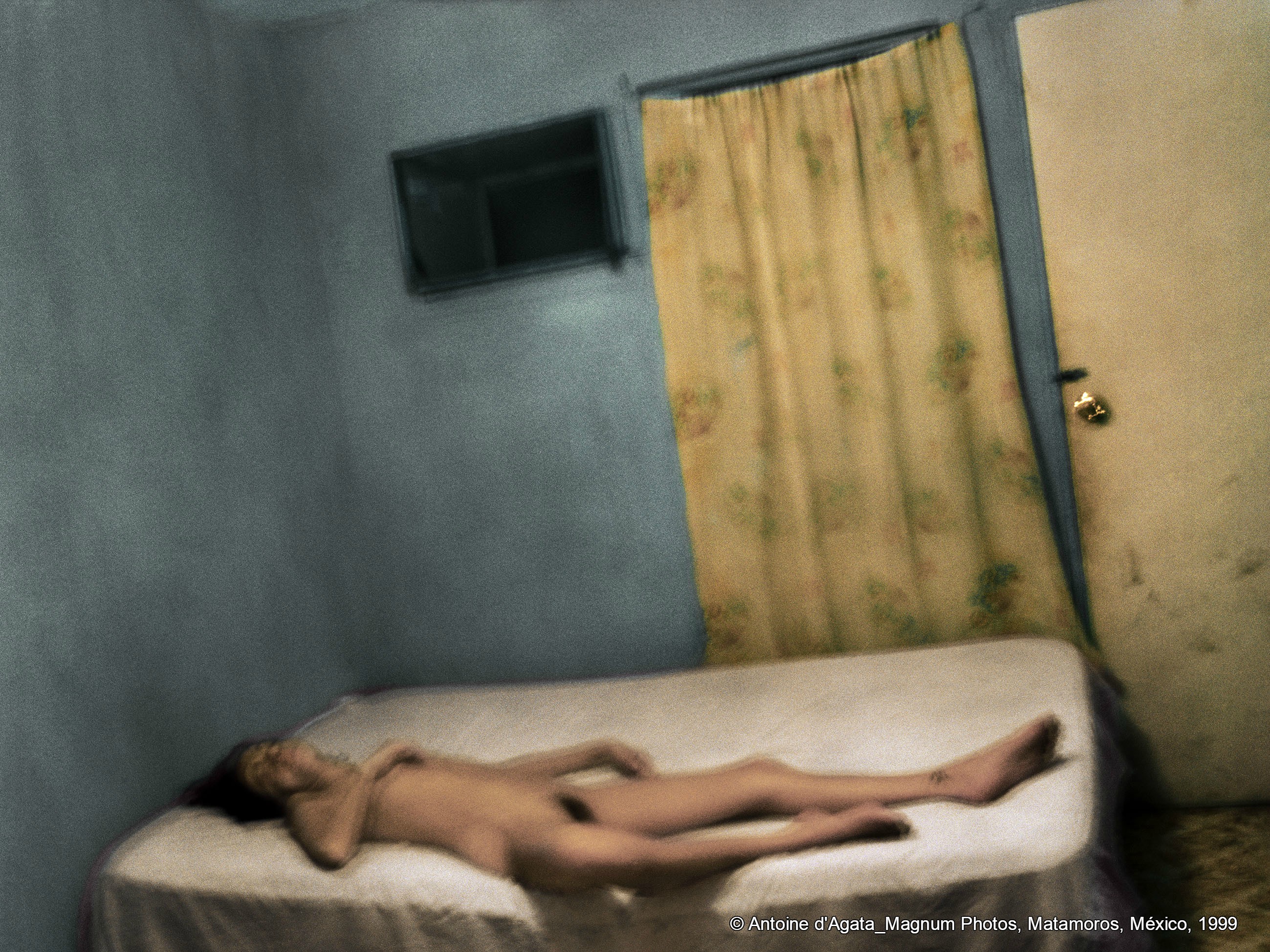Antoine d’Agata (Marsella, Francia, 1961) es un fotógrafo y director de cine, miembro destacado de la prestigiosa Agencia Magnum. En su obra nos narra generalmente un mundo oscuro, con personajes solitarios que habitan mundos obsesivos, o bien composiciones en las que parecen visualizarse los principales tabúes sociales: violencia, prostitución,…Para ello sus imágenes se retuercen y deforman, se desenfocan, llegando así a adquirir un cierto carácter abstracto que le permite mostrarnos las situaciones más que los personajes retratados.