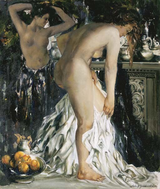 John R. Grabach (Newark, New Jersey, USA, 1886-1981) fue un artista y educador, autor de un libro clásico «How to draw the human figure«. Pintor de formación local, tuvo mucho prestigio entre 1920 y 1960. Podemos destacar dos etapas diferentes en su obra: una primera, de colores intensos y luminosos y una segunda, a partir de la gran depresión de 1929, en la que tanto sus colores como su temática se vuelven más oscuros y describen un mundo social convulso. Les muestros imágenes de los desnudos del autor que he localizado en internet.