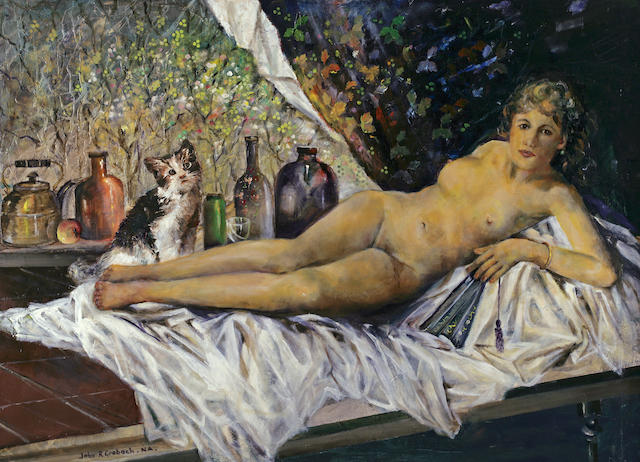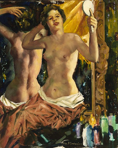 John R. Grabach (Newark, New Jersey, USA, 1886-1981) fue un artista y educador, autor de un libro clásico «How to draw the human figure«. Pintor de formación local, tuvo mucho prestigio entre 1920 y 1960. Podemos destacar dos etapas diferentes en su obra: una primera, de colores intensos y luminosos y una segunda, a partir de la gran depresión de 1929, en la que tanto sus colores como su temática se vuelven más oscuros y describen un mundo social convulso. Les muestros imágenes de los desnudos del autor que he localizado en internet.