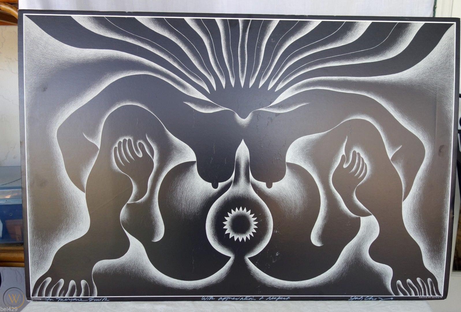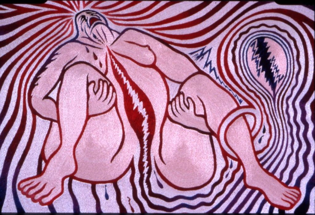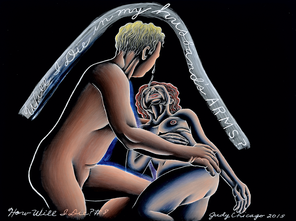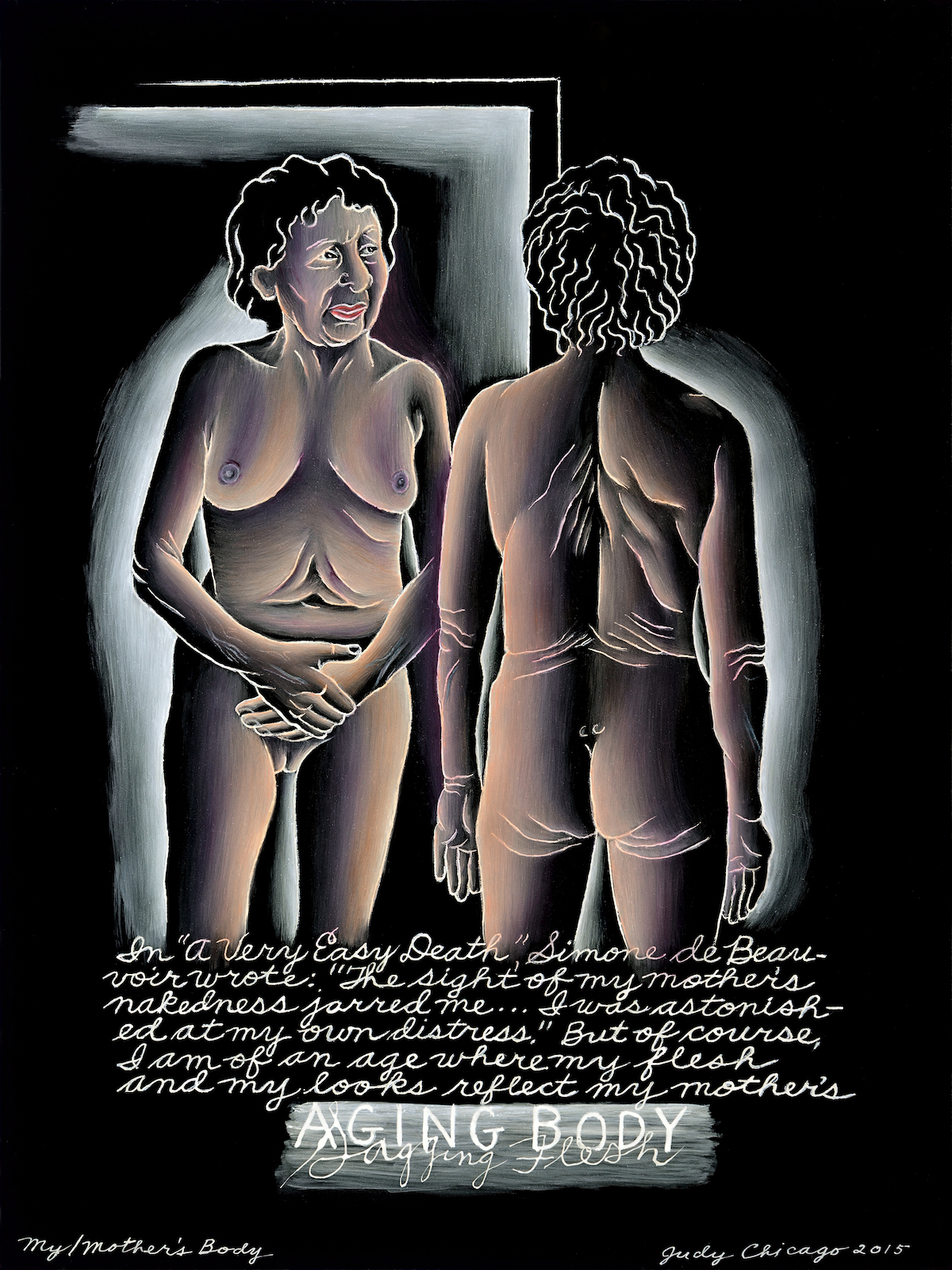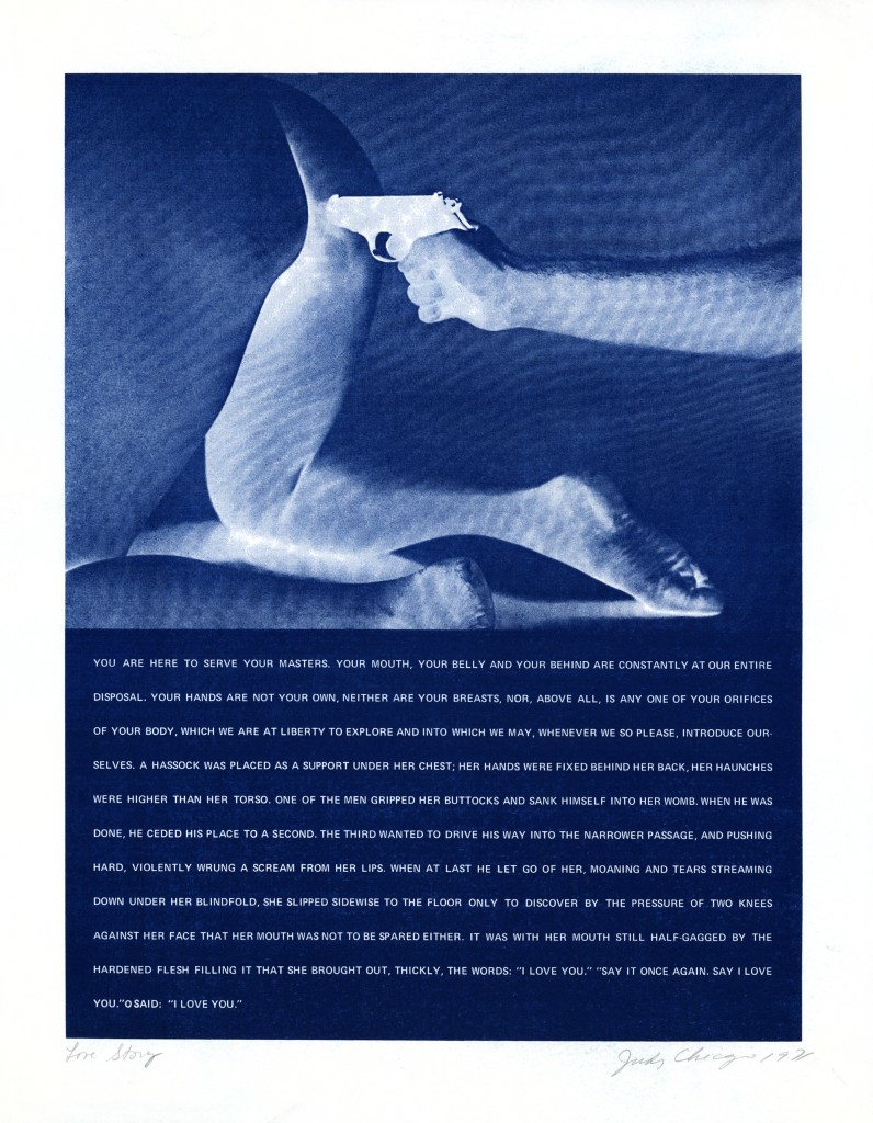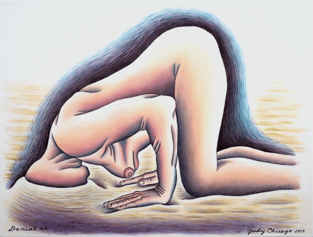 Cuando intentamos aproximarnos al desnudo en la obra de Judy Chicago (Chicago, Illinois, USA, 1939) debemos tener en cuenta que su representación corporal se encuentra mucho menos subordinada a criterios estéticos que a criterios políticos. Judy Chicago, pseudónimo de Judith Sylvia Cohen, es una de las exponentes más destacada del movimiento feminista americano de los años 70: la denominada «segunda ola feminista». Una luchadora incesante contra el sometimiento femenino a un patriarcado histórico del hombre. Por ello, aunque no resulte una de sus obras más significativas, empiezo con este grabado cuyo texto traduzco a continuación: