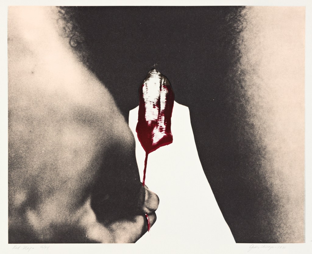 Posiblemente, de las numerosas obras de la artista – que incluyen grabados, fotografías, instalaciones, etc. – la que nos resulte más familiar es «Red Flag» en la que visualiza un conocido taboo: la menstruación femenina.