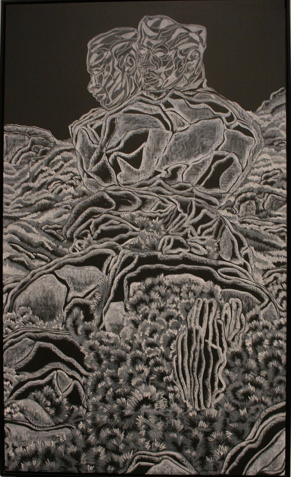 Su técnica también es excepcional. Se trata de dibujos realizados generalmente con lápices blancos o grises sobre un fondo negro, provocando efectos de luz que originan texturas de apariencia metalizada.
