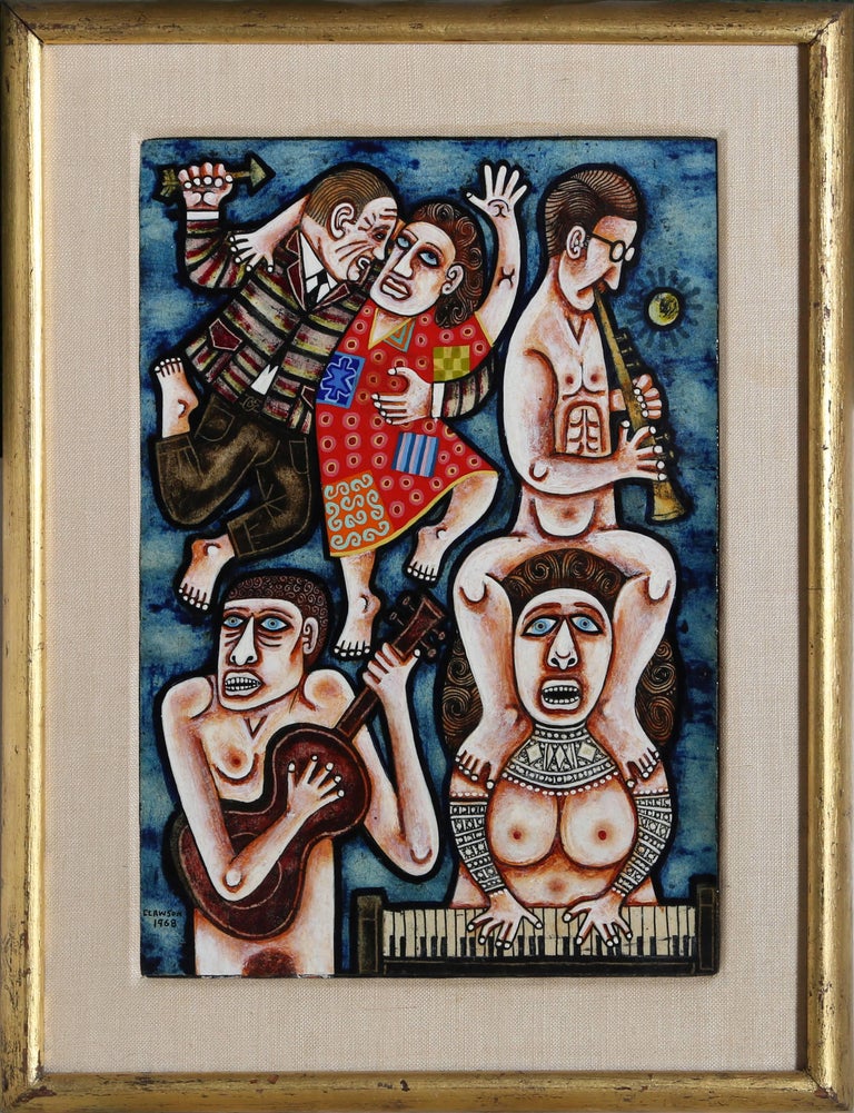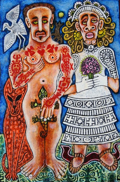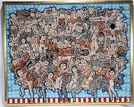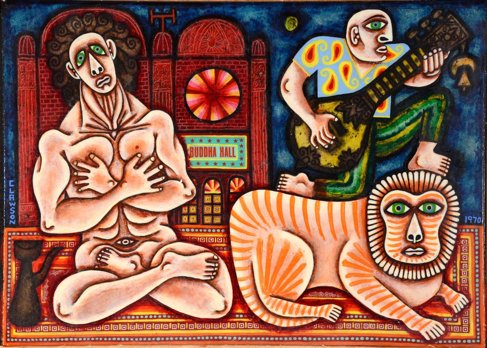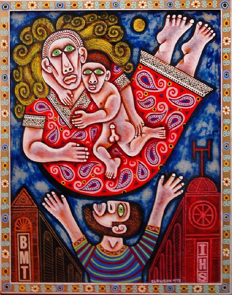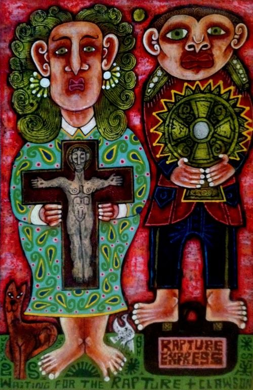 La obra de Rex Clawson (Dallas, Texas, USA, 1929-2007) está influenciada formalmente por el post impresionismo de Gauguin y Van Gogh, que conoció en un viaje juvenil a París, y por el arte tradicional de México, país en el que trabajó y vivió varios años. También deja su impronta en su pintura la obra cubista de Picasso y Braque. Su particular dibujo me recuerda los iconos medievales europeos. Su obra referencia fundamentalmente a temas sociales y políticos, con un aire irónico o satírico.